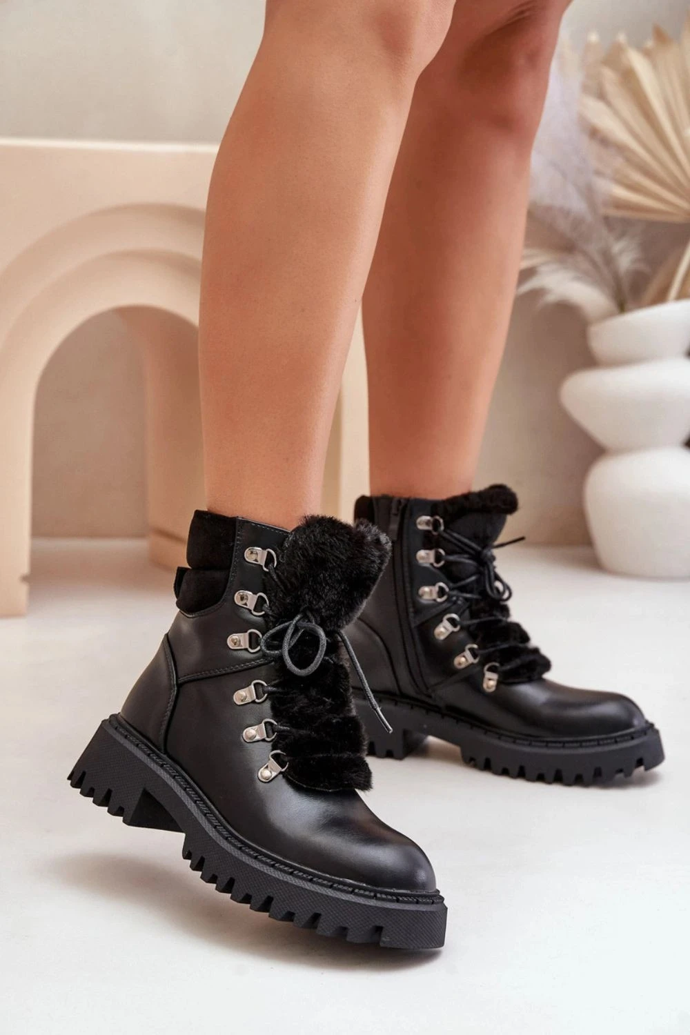 Dámské trapery vyrobené z ekokože jsou skvělou volbou na chladnější dny. Model se šněrováním a zipem usnadňuje rychlé obutí a zajišťuje ideální přizpůsobení. Jazyk boty je zdoben měkkým kožešinovým lemem, který dodává kouzlo a chrání před chladem. Vyztužená vnitřní vrstva zaručuje teplo a pohodlí během nošení, díky čemuž se trapery skvěle hodí jak na každodenní nošení, tak i v náročnějších povětrnostních podmínkách.
