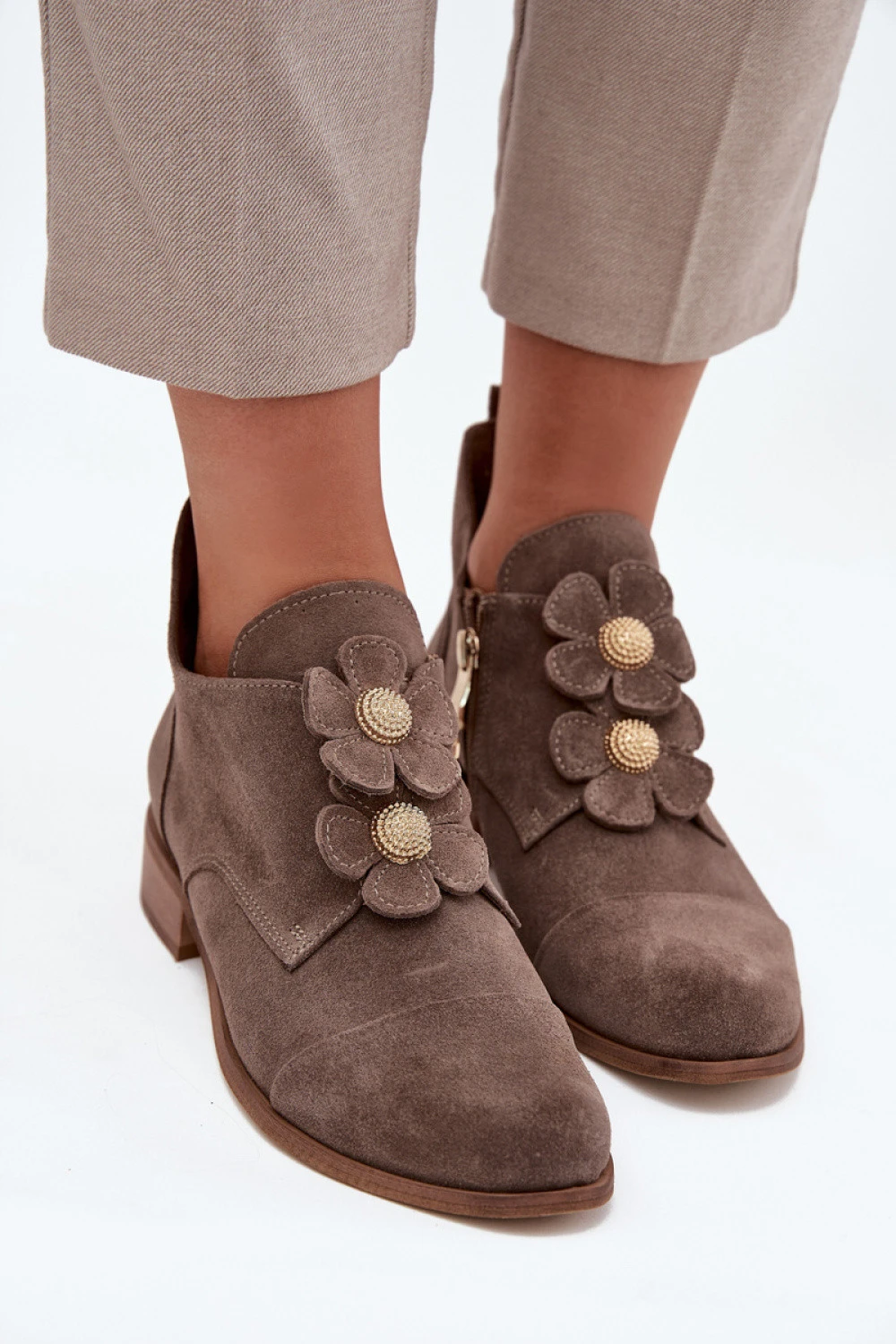 Elegantní dámské polobotky z přírodního semiše jsou jemným a stylovým návrhem pro různé příležitosti. Vyrobené z vysoké kvality semiše, vyznačují se jemným, ale výrazným vzhledem, obohaceným o dva dekorativní květy, které jim dodávají zvláštní kouzlo. Zapínají se na zip, co zajišťuje pohodlí a snadné obouvání. Tyto polobotky skvěle ladí s elegantními i casual stylizacemi, kombinují pohodlí s ženským, elegantním vzhledem.