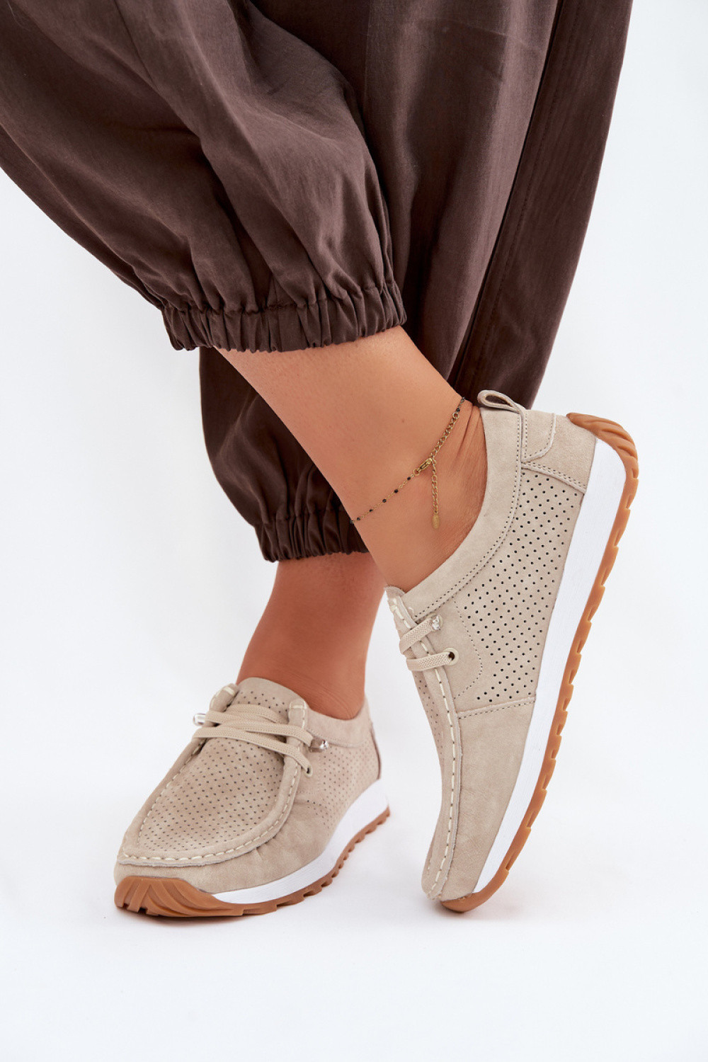 Dámské polobotky vyrobené z přírodního semiše jsou pohodlným a stylovým návrhem na každý den. Světlé díry na svršku dodávají obuvi lehkost a zajišťují lepší prodyšnost, co se osvědčí zejména v teplejších dnech. Model je vybaven elastickými gumičkami imitujícími šněrování, které usnadňují obouvání a umožňují dobré přizpůsobení k noze. Vnitřek boty doplňuje měkká stélka typu Comfort Shoes, zvyšující pohodlí i při dlouhém nošení. Boty jsou lehké a pohodlné, díky čemuž se skvěle hodí do každodenního užívání. Ideální volba pro ženy, které ocení kombinaci pohodlí a módního vzhledu.
