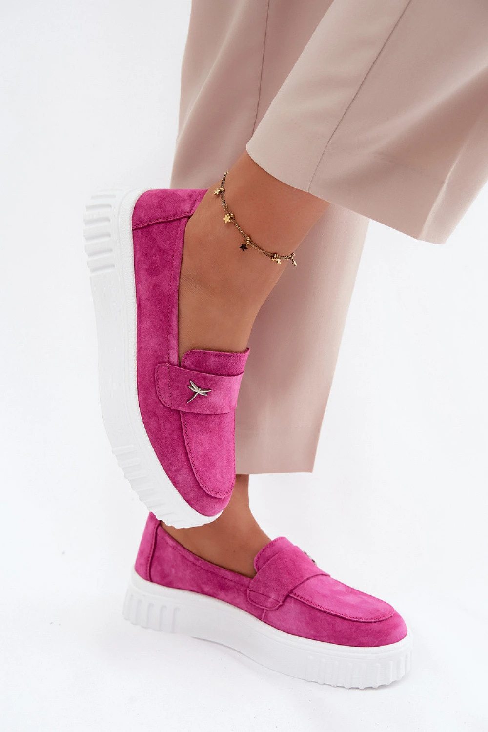 Polobotky pro ženy z přírodní semišové kůže jsou pohodlnou a stylovou volbou na každý den. Univerzální střih vám umožní skvěle kombinovat s různými kousky oblečení, vytvářející volné a zároveň propracované outfit. Zvýšená platforma jemně zvedá postavu a zajišťuje pohodlí při chůzi. Vepředu je pásek s ozdobným prvkem, který dodává celkovému vzhledu charakter a zdůrazňuje módní vzhled modelu. Měkká kůží podšívka zvyšuje pohodlí nošení, díky čemuž se polobotky perfektně hodí i na delší nošení. Jedná se o skvělou volbu k džínům, látkovým kalhotám nebo každodenním outfitům, kdy je důležitý komfort a styl.