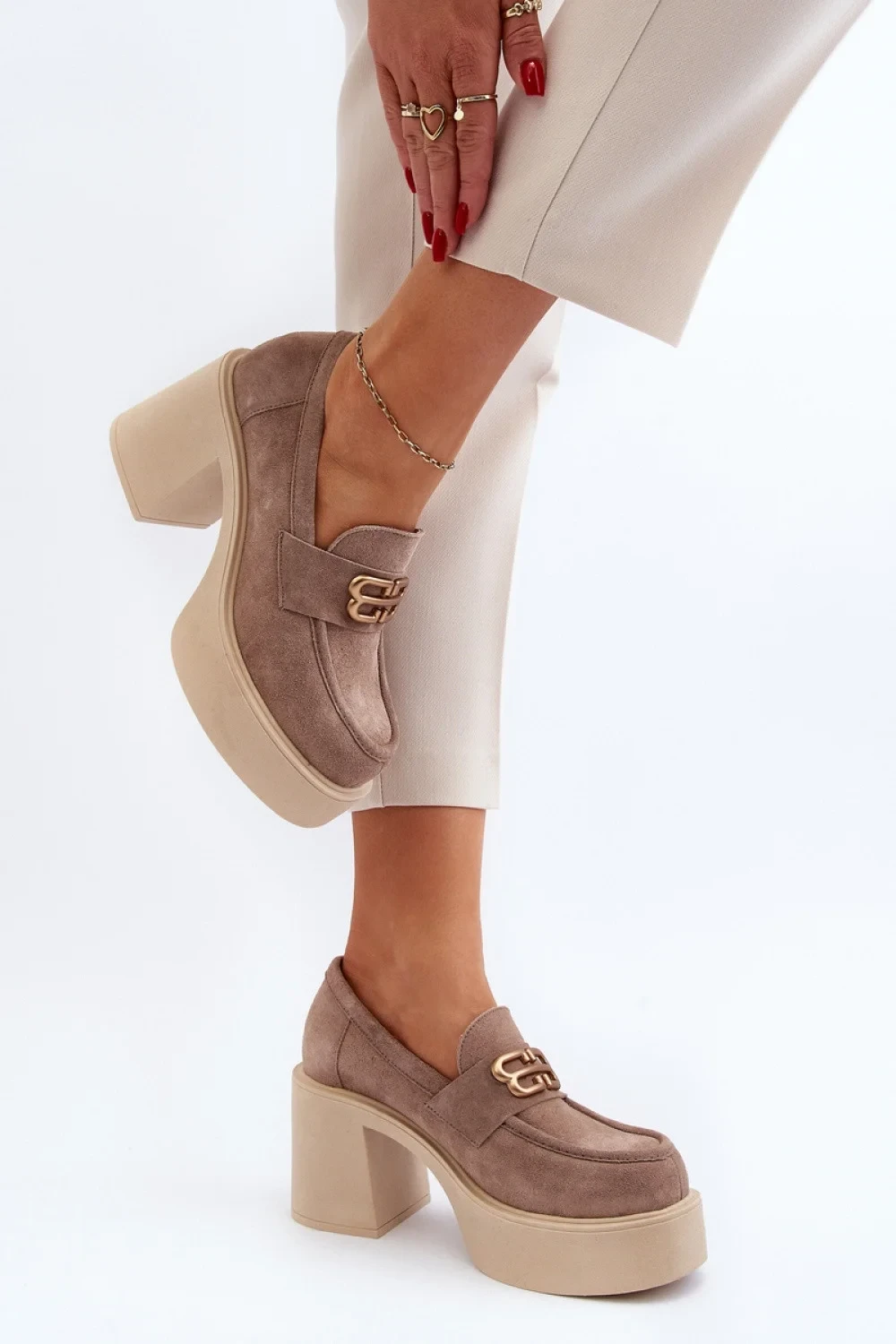 Dámská obuv na vysokém podpatku se svrškem z ekokůže. Osazeny na silné podrážce a podpatku v podobě masivního sloupku. Tento model má zakulacený nos. Kožená stélka zajistí pohodlí při používání. Pásek a ozdoba na přední straně.