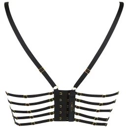 Tento extrémně stabilní a bohatě zdobený polokorzet si již našel cestu do srdcí zákazníků. Vyhrnutá část podprsenky pod prsy je podšitá tylem tělové barvy, přes který je výrazná černá krajka. Košíčky jsou také vyrobeny z jedné vrstvy krajky s bohatým vzorem, takže pohled pozorovatele se soustředí pouze na vás a vaše půvaby. Kromě toho jsou popruhy na hrudi a zádech zdobeny prvky ve zlaté barvě, aby v nočním světle výrazněji zářily. Model se zapíná pomocí pětiřadového zapínání na háčky a očka s dvoustupňovým nastavením obvodu. Popruhy u tohoto modelu nejsou odepsané.