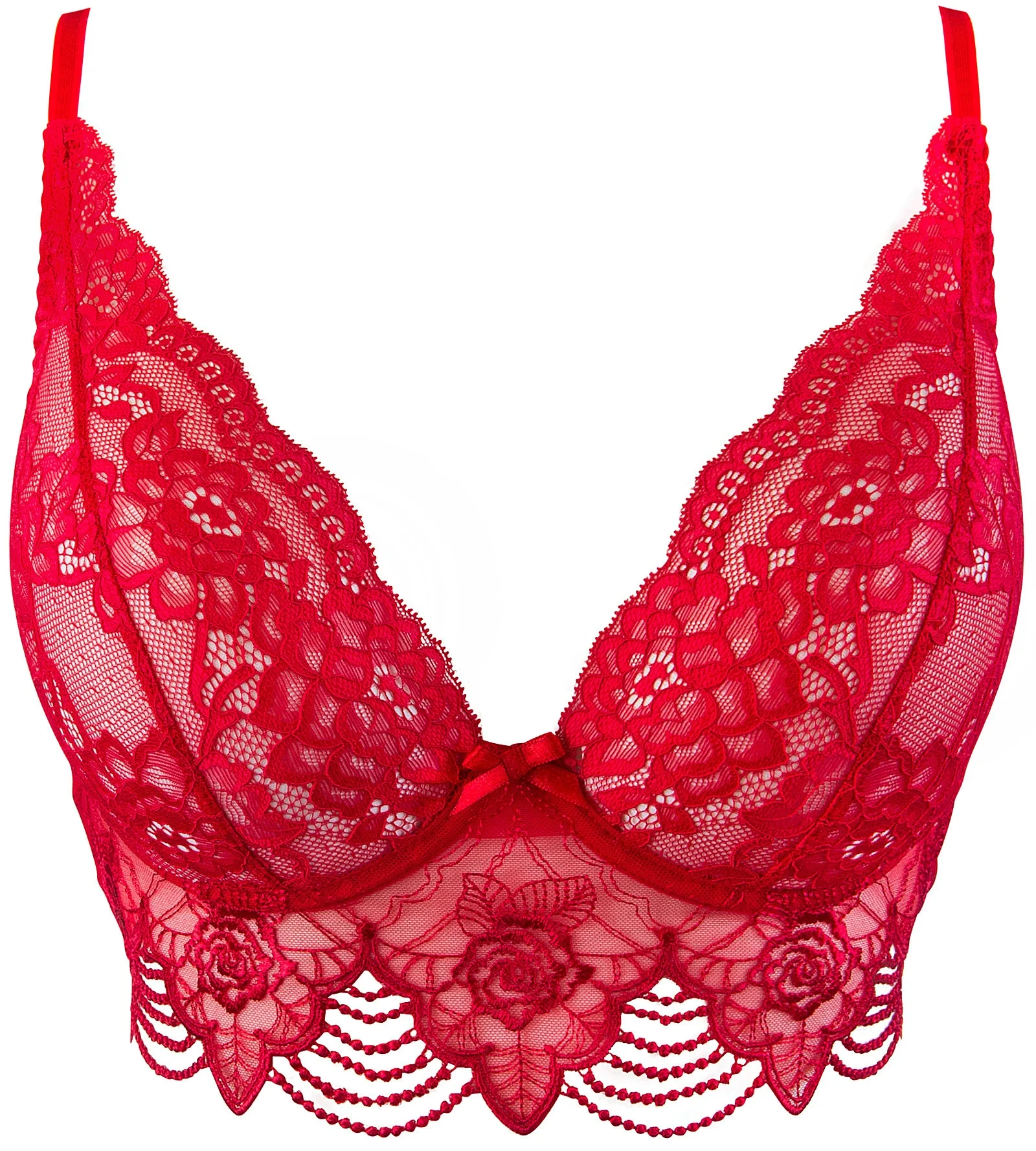 Měkký krajkový polokorzet v sytě plamenné červené barvě s květinovou výšivkou a zvlněnými ozdobami zdobí ňadra a dodává jim výrazný a šťavnatý tvar.