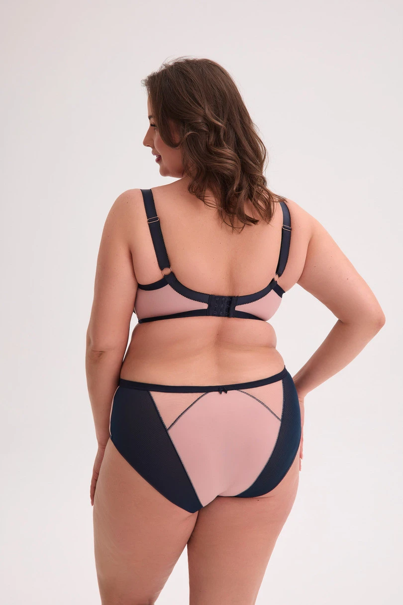Odkryj elegancję i wygodę w jednym – biustonosz typu semi soft z granatową koronką na cielistym tle to doskonałe połączenie zmysłowości i komfortu. Transparentna baza tworzy efekt „nude”, który pięknie współgra z misterną, granatową koronką w kwiatowy wzór. Półusztywniane miseczki delikatnie modelują biust, zapewniając mu stabilne podparcie. Komfortowe, szerokie ramiączka odciążają ramiona, co czyni ten model idealnym wyborem dla kobiet z pełniejszym biustem. Biustonosz sprawdzi się zarówno na co dzień, jak i pod bardziej wymagające stylizacje.