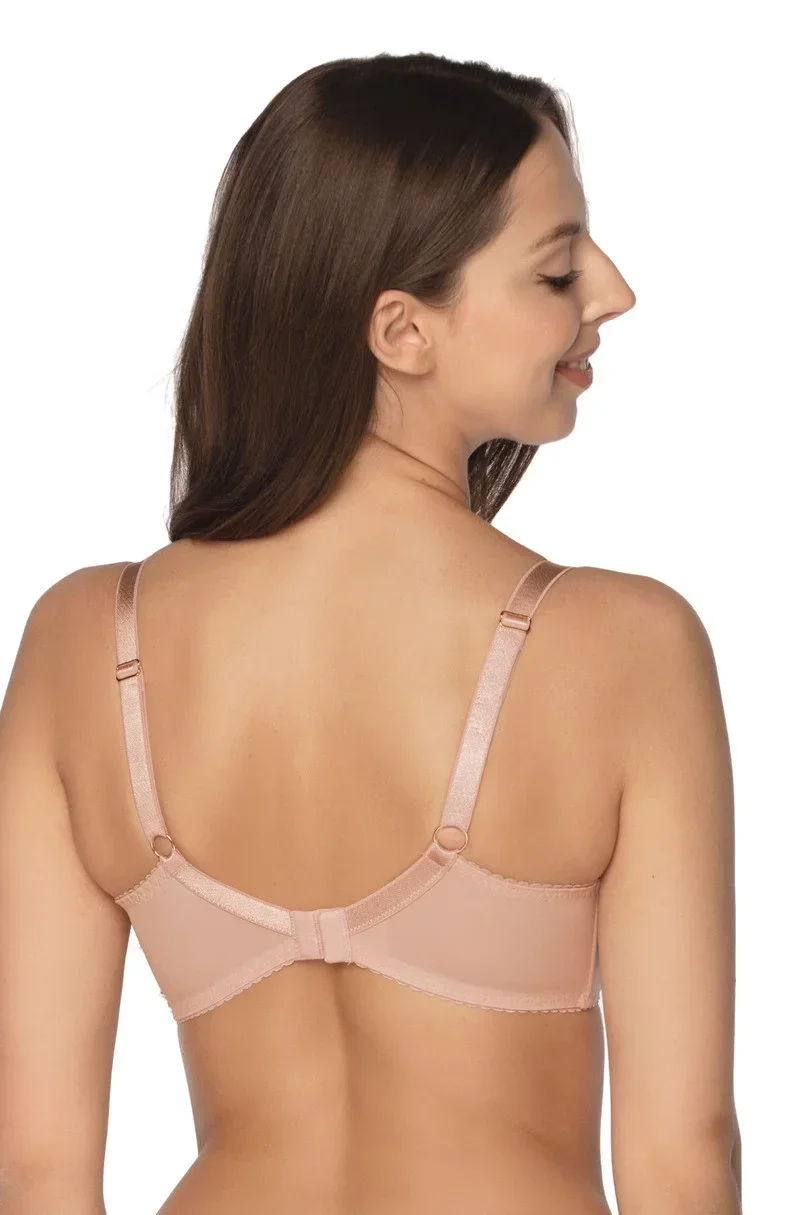 Poloměkká podprsenka s kosticemi, spodní část košíčků z pěny pokrytá efektní krajkou, horní část košíčků z tylu zakončená lamówlem.