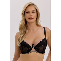 Polovyztužená podprsenka Violeta Art. 1345 je jedinečným spojením smyslnosti a elegance. Udržovaná v moka odstínech s akcenty sytě černé barvy působí nesmírně elegantně a žensky. Měkké, polovyztužené poloměkké košíčky krásně tvarují poprsí a dodávají mu přirozený, zaoblený tvar. Průhledná horní část košíčků z jemné síťoviny decentně zvýrazňuje dekolt a spodní část - zdobená jemným krajkovým vzorem - dodává eleganci. Zadní díl z elastického mikrovlákna zajišťuje pohodlí a dokonalé přizpůsobení postavě.