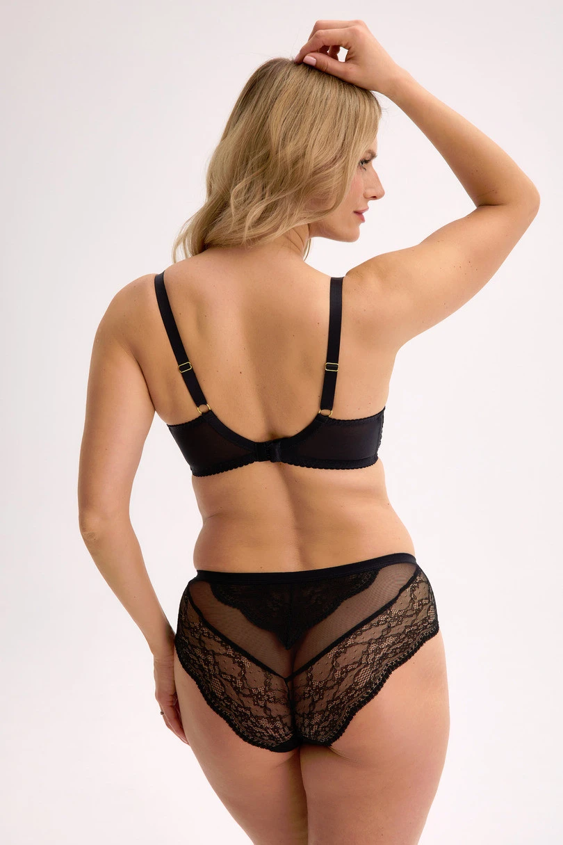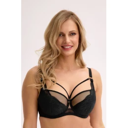 Biustonosz semi-soft w klasycznej czerni to połączenie nowoczesnego designu z elegancją i funkcjonalnością. Model wyróżnia się miękką górną częścią miseczki wykonaną z transparentnego tiulu oraz dolną usztywnioną częścią z pięknej koronki. Konstrukcja doskonale zbiera i lekko unosi biust, nadając mu naturalny, zaokrąglony kształt. Dekolt zdobią zmysłowe paseczki (odpinane), które nie tylko przyciągają wzrok, ale również optycznie podkreślają kształt piersi. Plecy zostały wykonane z elastycznego tiulu, a boczne fiszbiny dbają o stabilność. Biżuteryjna zawieszka w mostku dodaje całości luksusowego akcentu. To idealny wybór dla kobiet, które chcą połączyć wygodę z odważnym stylem.