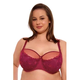 Podprsenka GAIA pro velké poprsí je dokonalou kombinací elegance a spolehlivé opory, která je určena ženám hledajícím pohodlí a krásný vzhled. Polovyztužené košíčky vyrobené z pevné průhledné síťoviny a zdobené krajkou v hluboké malinové barvě jí dodávají jemnou smyslnost. Horní lem zakončený jemným páskem dodává podprsence eleganci a lehkost. Pevná konstrukce s bočními velrybími kosticemi podpírá a stabilizuje poprsí a zajišťuje pohodlí a jistotu po celý den. Podprsenka GAIA je synonymem stylu, pohodlí a perfektního střihu - splní očekávání žen, které ocení kvalitu a výjimečný design.