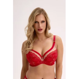Biustonosz MIRELLA w konstrukcji SS5 (1058 sonia) w zmysłowej, ognistej czerwieni. Charakterystyczna, nieusztywniona górna część miseczki została wykonana z transparentnej siatki, która lekko opina biust i nadaje całości delikatności. Dolna część miski wzmocniona jest pianką gorseciarską i pokryta elegancką koronką, która subtelnie ozdabia i modeluje piersi. Konstrukcja SS5 doskonale zbiera i unosi biust, podkreślając jego naturalny kształt, a przy tym zapewnia komfort nawet podczas dłuższego noszenia. Detale w postaci czerwonej lamówki i paseczków przy dekolcie dodatkowo akcentują seksowny charakter modelu. To idealna propozycja na specjalne okazje, jak i do codziennych, odważnych stylizacji.