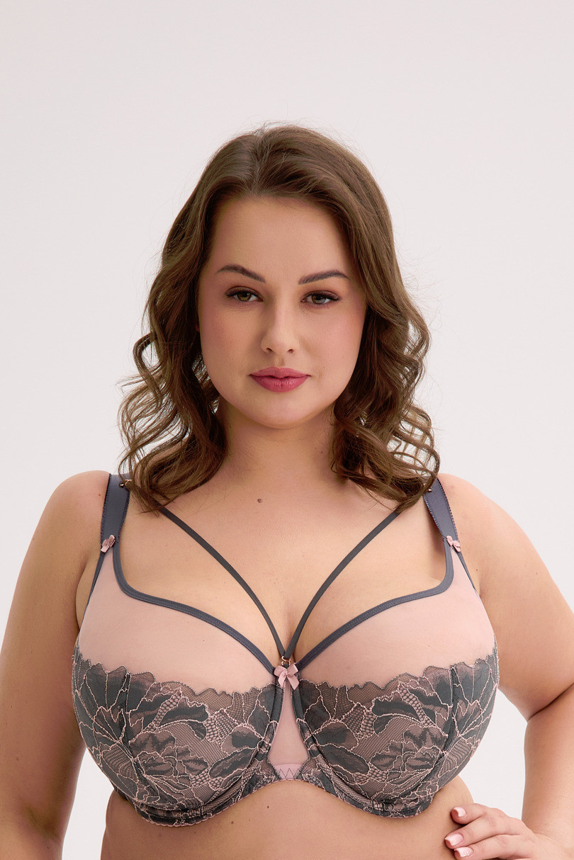 Ten biustonosz typu semi soft to idealna propozycja dla kobiet, które szukają połączenia funkcjonalności, podtrzymania i zmysłowego designu. Model wyróżnia się głęboką miską, która doskonale zbiera i eksponuje biust, nadając mu naturalny, pełny kształt. Dolna część miseczek jest lekko usztywniona, podczas gdy górna wykonana z transparentnego tiulu pięknie eksponuje dekolt. Całość zdobi srebrzysta koronka w formie kwiatowego haftu, która harmonijnie kontrastuje z pudrowym różem i grafitową lamówką.