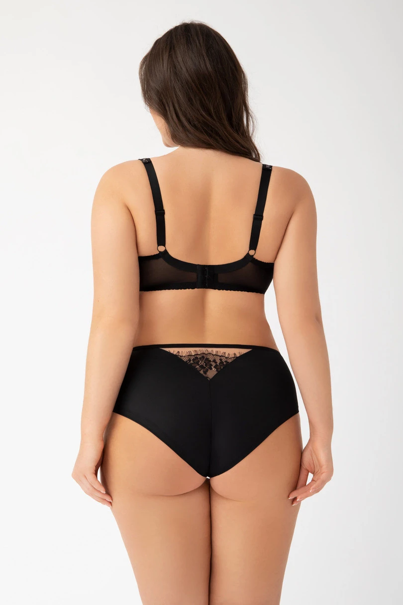 Biustonosz o eleganckim, klasycznym kroju. Model ma gładkie, profilowane miseczki, które zapewniają stabilne podtrzymanie i ładne ułożenie biustu. Górna część miseczek została ozdobiona delikatną, kwiatową koronką, która subtelnie przechodzi w lekkie, półtransparentne wstawki przy dekolcie oraz w środkowej części stanika. Koronkowe detale dodają bieliźnie kobiecego, zmysłowego charakteru, jednocześnie zachowując ponadczasową elegancję. Ramiączka są regulowane, a całość wygląda komfortowo i estetycznie – zarówno na co dzień, jak i na specjalne okazje. Neutralne tło podkreśla głęboki czarny kolor oraz precyzyjne wykończenie.