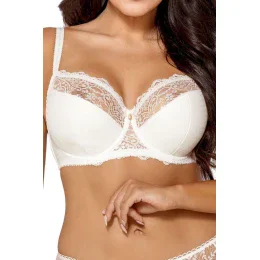 Tato fenomenální podprsenka typu semi-soft krásně zvýrazňuje ženské tvary a současně nadnáší poprsí a je zárukou maximálního pohodlí při nošení. Podprsenka je vyrobená ze světlé látky a z jemné výšivky. Spodní část košíčků je vyztužená pěnou. Boční kostice pomáhají podprsenku vypasovat a udržet ji na správném místě. Model je ideální pro každodenní nošení. Podprsenka je k dostání také ve velikostech maxi. Komplet je možné vytvořit s klasickými kalhotkami, nebo s kalhotkami string.