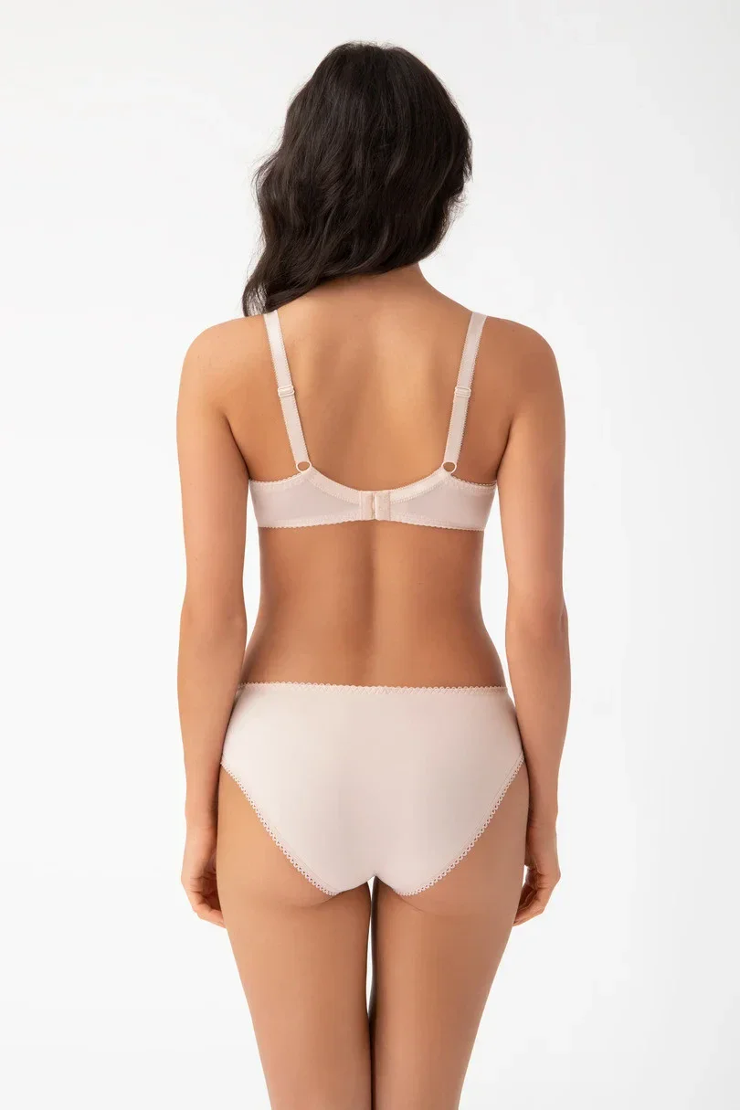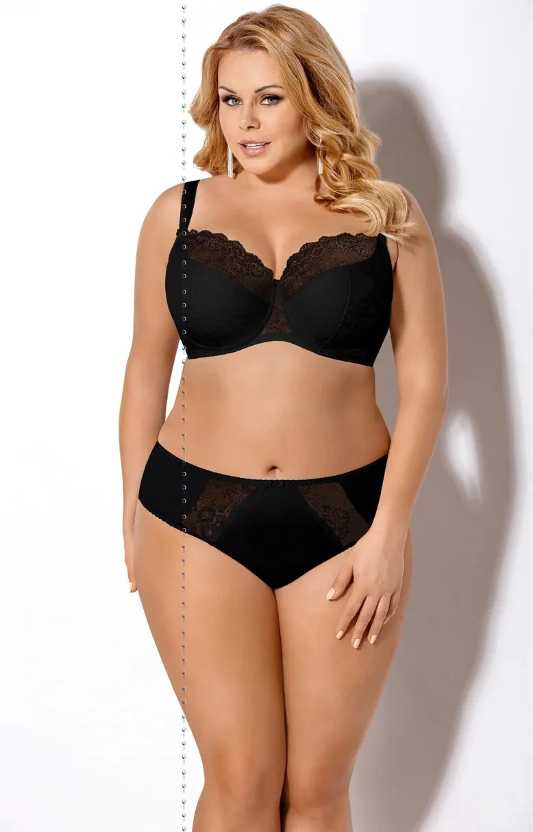 Krásná polovyztužená podprsenka z pěkné, elastické krajky. Spodní část košíčků je vyztužená pěnovým materiálem a zevnitř jsou košíčky podšité bavlnou. Horní část košíčků je krajková a pro větší pohodlí a lepší pasování podšitá pevnější síťkou. Model prsa krásně pozvedne a zakulacuje. Podprsenka krásně přiléhá a je ozdobená mašličkou. Ramínka jsou nastavitelná, neodepínací a podle velikosti podprsenky se liší jejich šířka. Na bocích jsou svislé kostice. Zapínání na dva či tři háčky (podle velikosti modelu) s třístupňovou regulací.