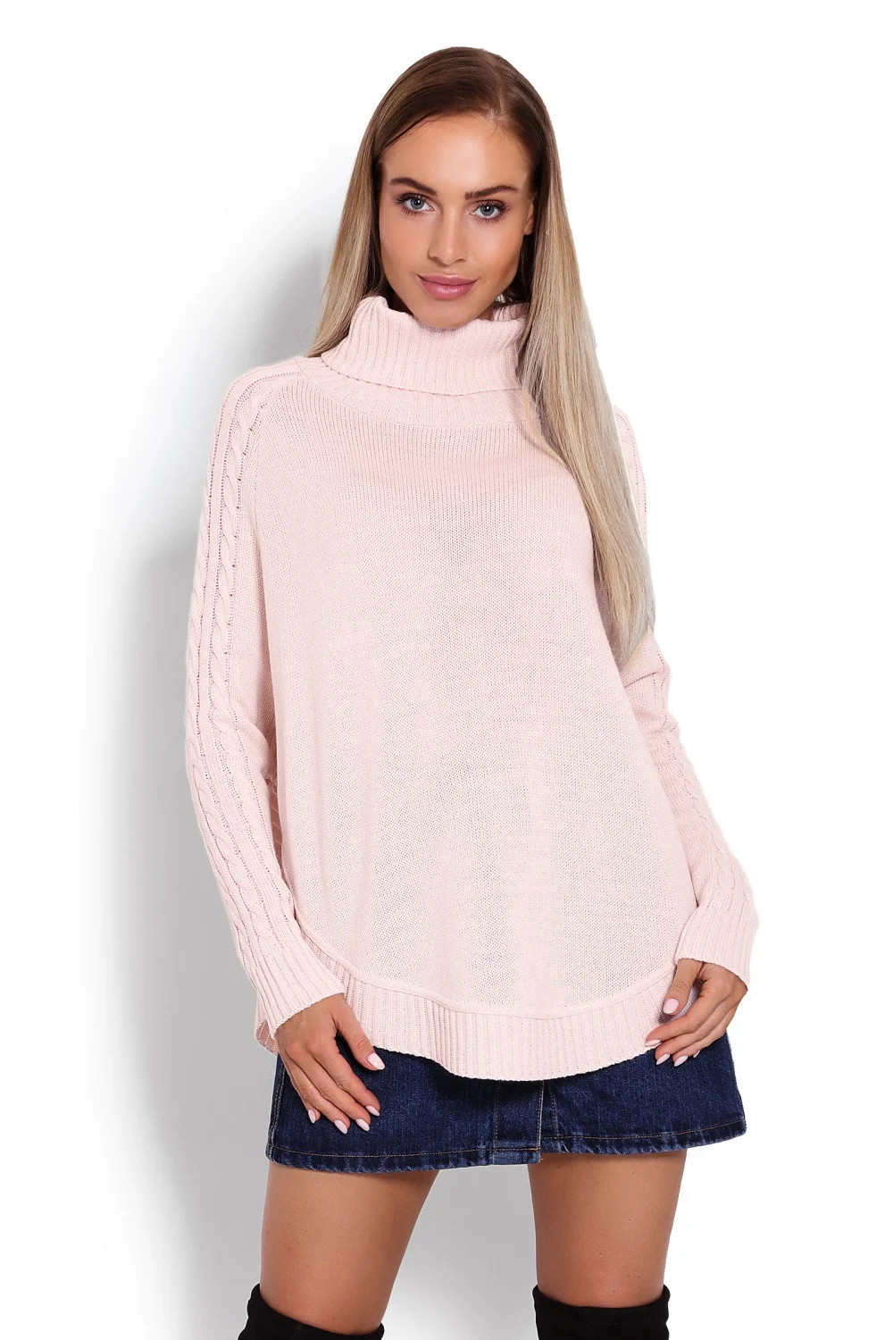 Pončo se zaobleným spodním okrajem. Rolák. Pletený vzor na rukávech. Pončo s originálním střihem. Pečlivé zpracování.