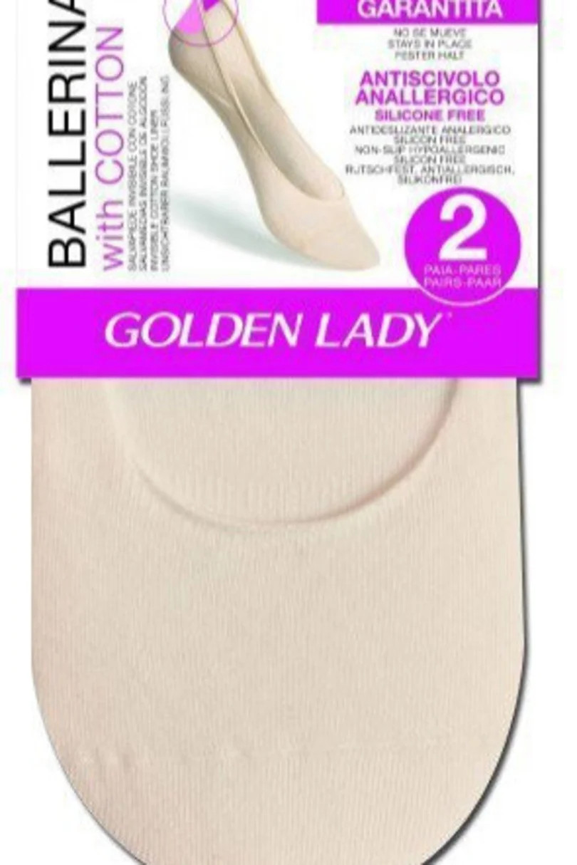 Velice pohodlné ponožky balerínky značky Golden Lady. Jsou tenké a ušité z kvalitní bavlny s přídavkem lycry. Silikonový pásek na patě zabraňuje sesouvání ponožky. Ideální do balerín.