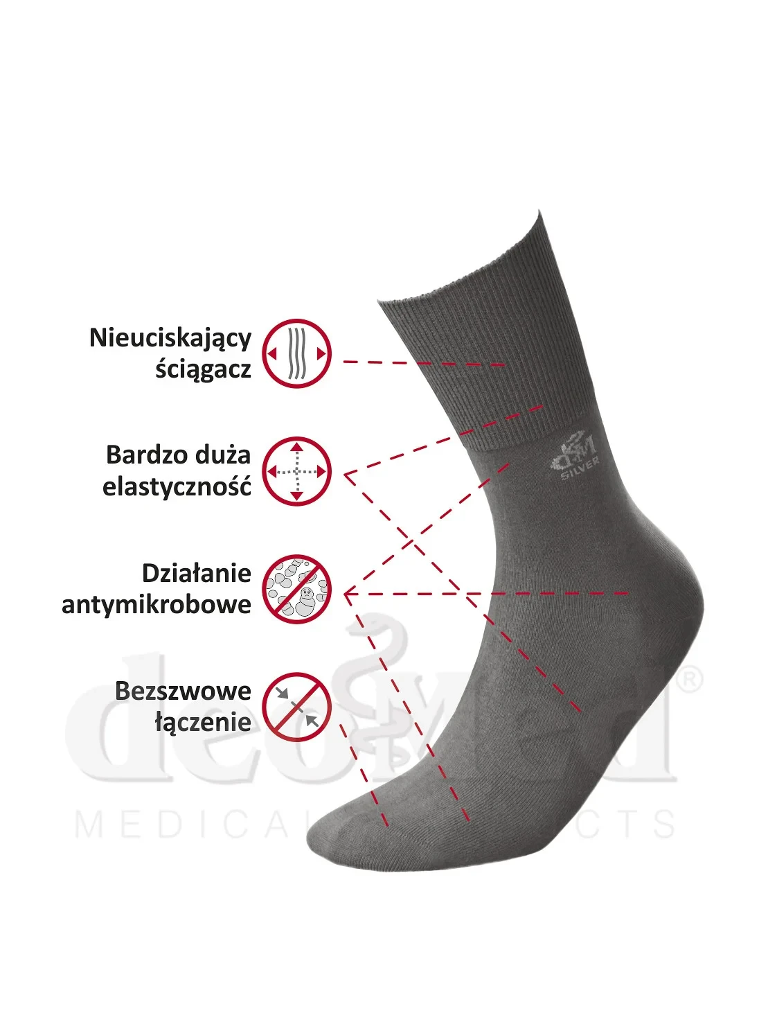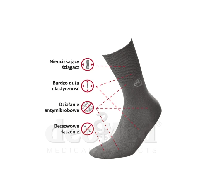 Díky speciálnímu tvaru a střihu ponožky při nošení netlačí. Model je na špičkách spojený bezešvou technologií, a proto je maximálně pohodlný a komfortní. Obsah iontů stříbra v přízi PROLEN Slitex brání množení mikrobů a předchází vzniku nepříjemného zápachu při nošení. Ponožky působí proti vzniku a množení hub a bakterií. Model je ideální pro osoby s velmi citlivými chodidly.