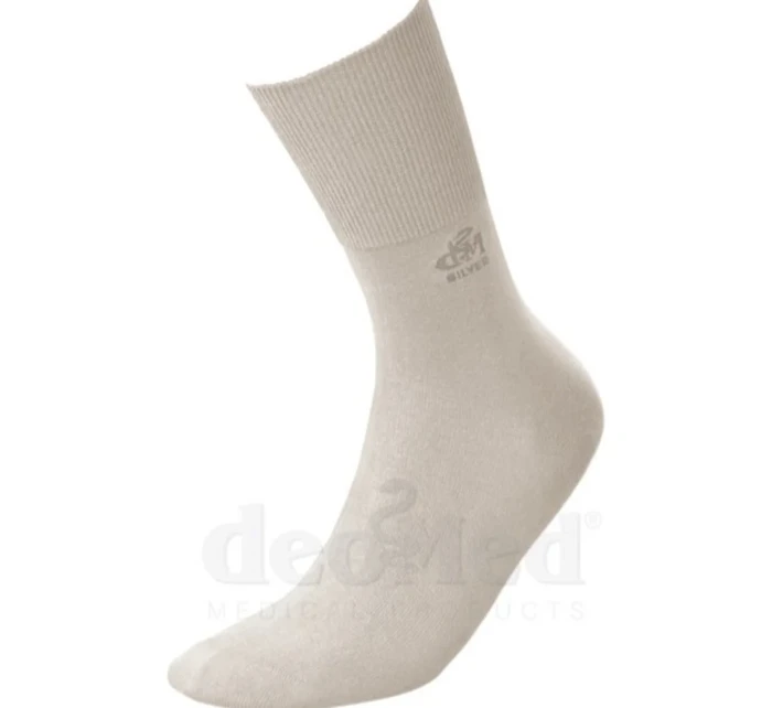 DEOMED COTTON SILVER-skarpetki zdrowotne z przędzy bawełnianej ze srebrem Skład: bawełna 72%, Prolen® Siltex ze srebrem 25%, Elastan 3%. Specjalna konstrukcja cholewki i niewielka domieszka elastanu w całym wyrobie powodują idealne bezuciskowe przyleganie do nóg i maksymalną elastyczność - nietamowanie przepływu krwi i komfort nawet dla opuchniętych nóg. Bezszwowe łączenie nad palcami gwarantuje wygodę osobom o bardzo wrażliwych stopach, np. stopach cukrzycowych. Zawartość jonów srebra w przędzy PROLEN®Siltex hamuje rozwój mikrobów, zapewniając skuteczne działanie antybakteryjne i antygrzybicze. Do produkcji skarpetek jest używana czysta bawełna - naturalna przędza najwyższej jakości.