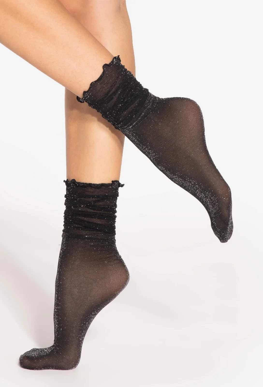 Složení: nero-stříbrná 68 % polyamid, 27 % metalizovaná příze, 5 % elastan; visonově zlatá 62 % polyamid, 33 % metalizovaná příze, 55 % elastan