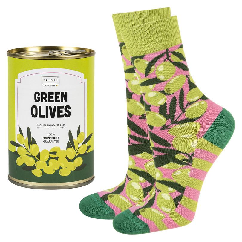 Skvělý tip na dárkový komplet - dámské barevné ponožky SOXO - olivy v plechovce.