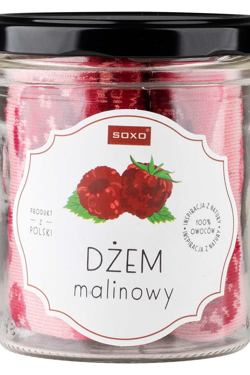 - Jedyny w swoim rodzaju dżem od Soxo. Wyobraź sobie moment, w którym otwierasz słoik, a w nim znajdujesz mięciutkie skarpetki z motywem malin i pachnące malinami. To świetny pomysł na prezent! skład surowcowy: 80% bawełna, 15% poliamid, 5% elastan.
