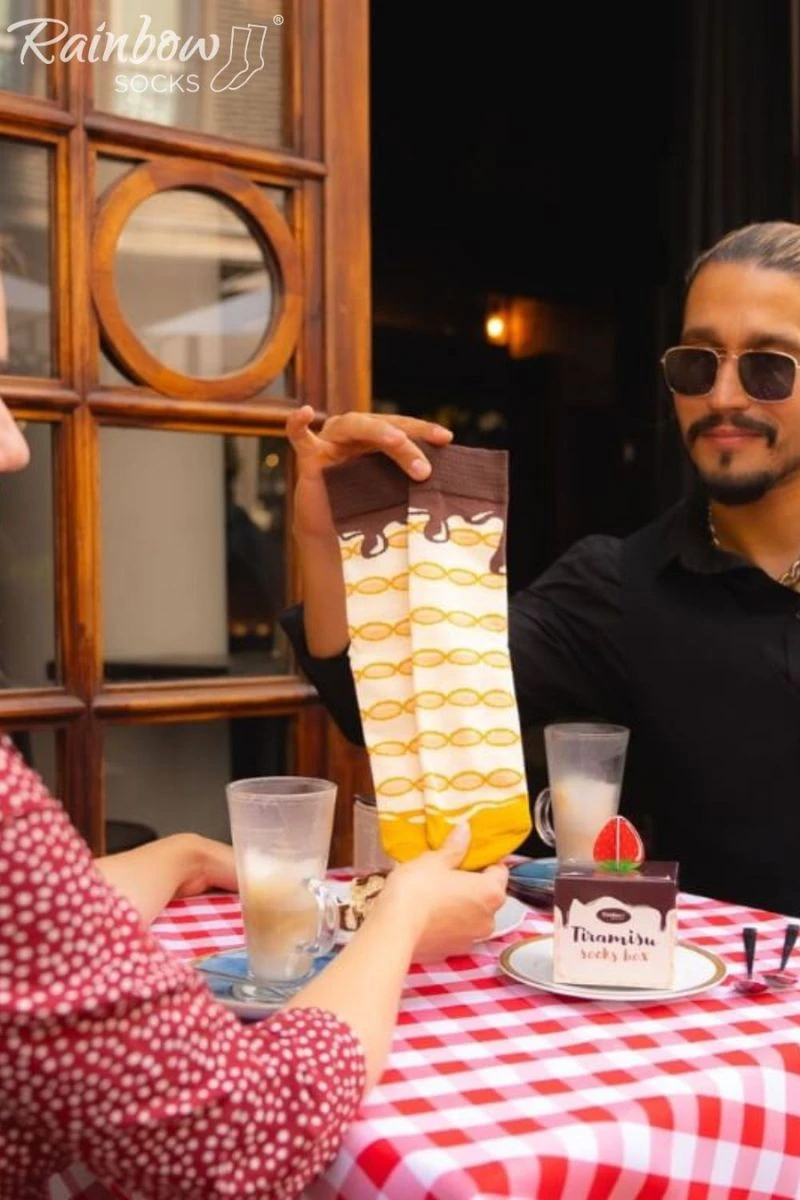 Vaše oblíbený italský dezert ve formě ponožek. Vaše přítelkyně je mistryní přípravy italského tiramisu, nebo možná jeho variace s jahodami? Možná váš nejlepší kamarád má zájem o kuchyně z celého světa a hledáte originální dárek navazující na jeho koníček? Jste na správném místě! Ponožky tiramisu jsou opravdovým italským dárkem, který potěší každého - nejen milovníky italské kultury. Ponožky ve formě tiramisu budou také ideální třešničkou na dortu jako dárek pro oslavence. Jen se ujistěte, že najdou místo v šuplíku na ten lahodný dezert!EAN čárové kódy zboží jsou: