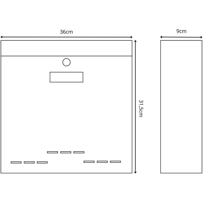 Rozměry 36x9x31,3 cm poskytují dostatečnou kapacitu, která umožňuje ukládat korespondenci, dokumenty a malé balíčky bez nutnosti častého vyprazdňování schránky. Díky kompaktní hloubce (9 cm) je schránka prostorově úsporná, takže je ideální pro montáž na zeď nebo plot. Univerzální formát usnadňuje umístění do různých prostor a poskytuje pohodlný a rychlý přístup k dopisům.