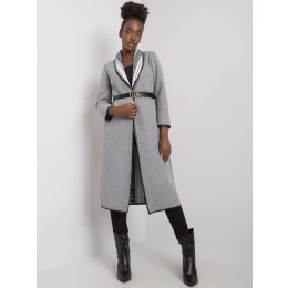Šedý melanžový kabát s kapsami a páskem.