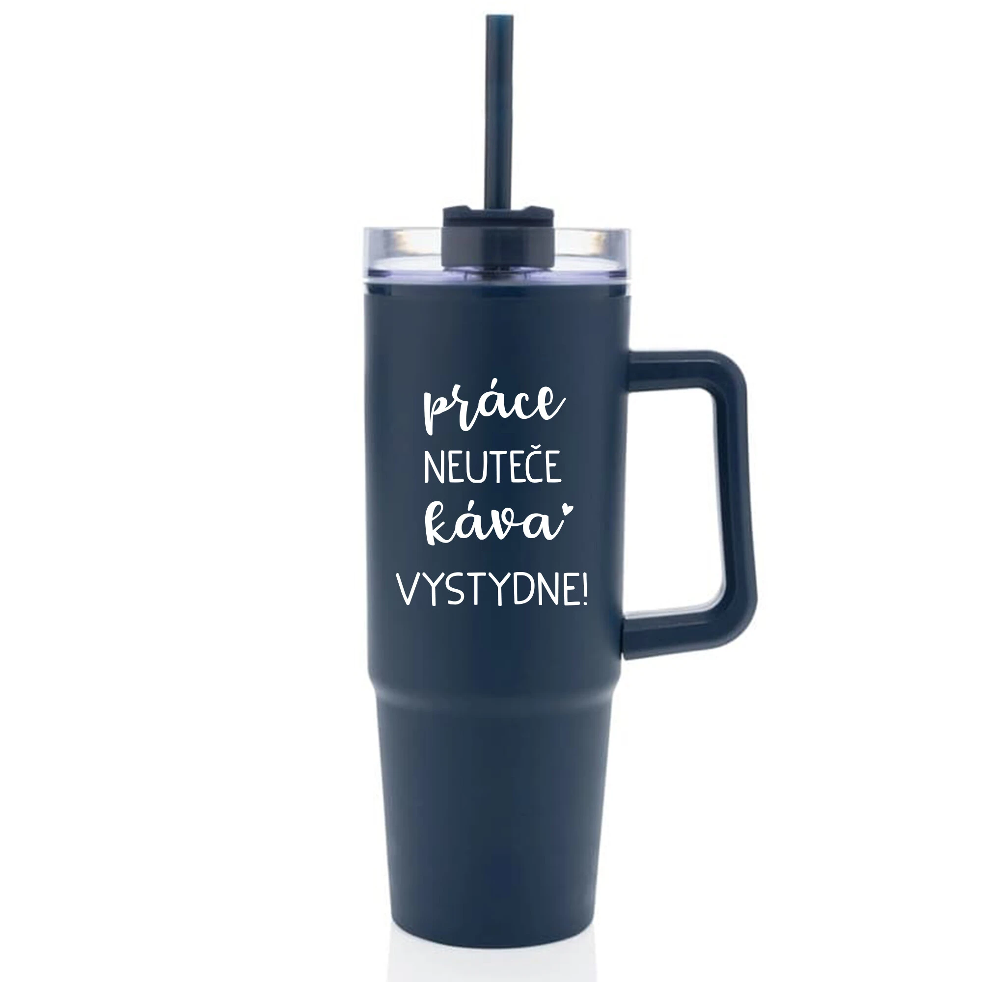 PRÁCE NEUTEČE, KÁVA VYSTYDNE! - modrý cestovní termohrnek s průhledným víčkem 900 ml
