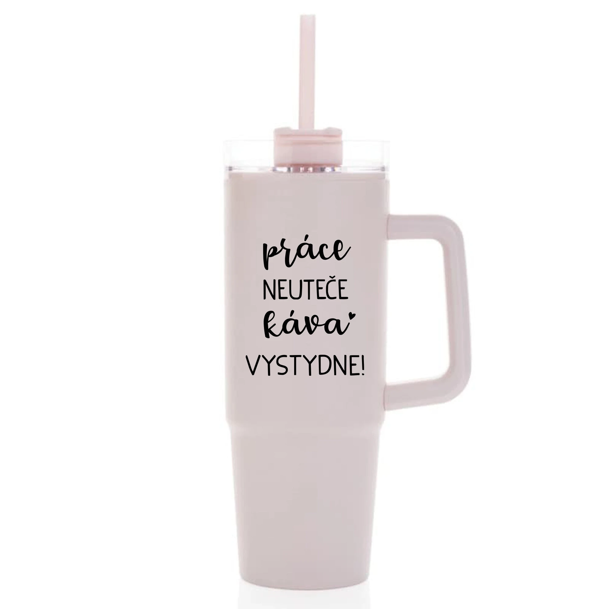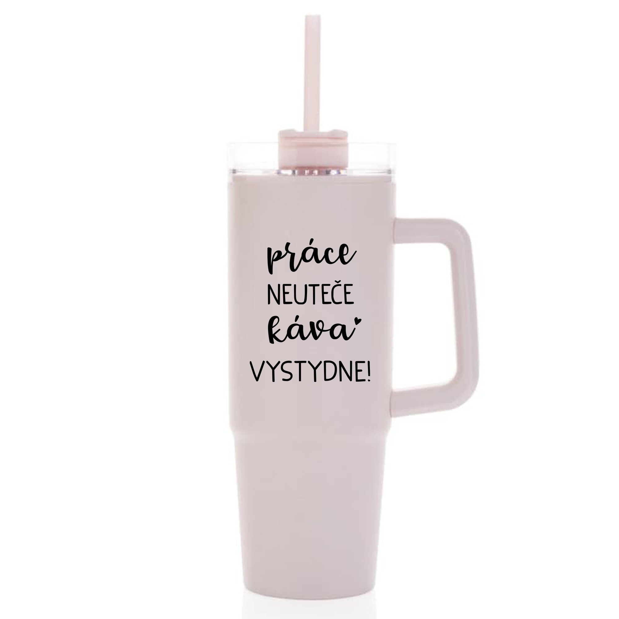 PRÁCE NEUTEČE, KÁVA VYSTYDNE! - růžový cestovní termohrnek s průhledným víčkem 900 ml