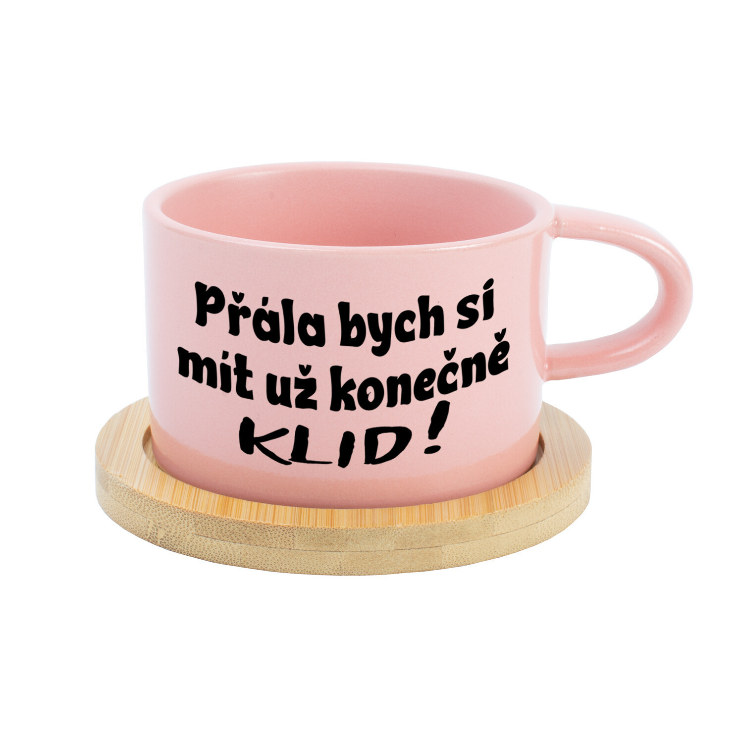 Keramický hrneček „Makronka“ s bambusovým podtáckem – Přála bych si mít už konečně KLID