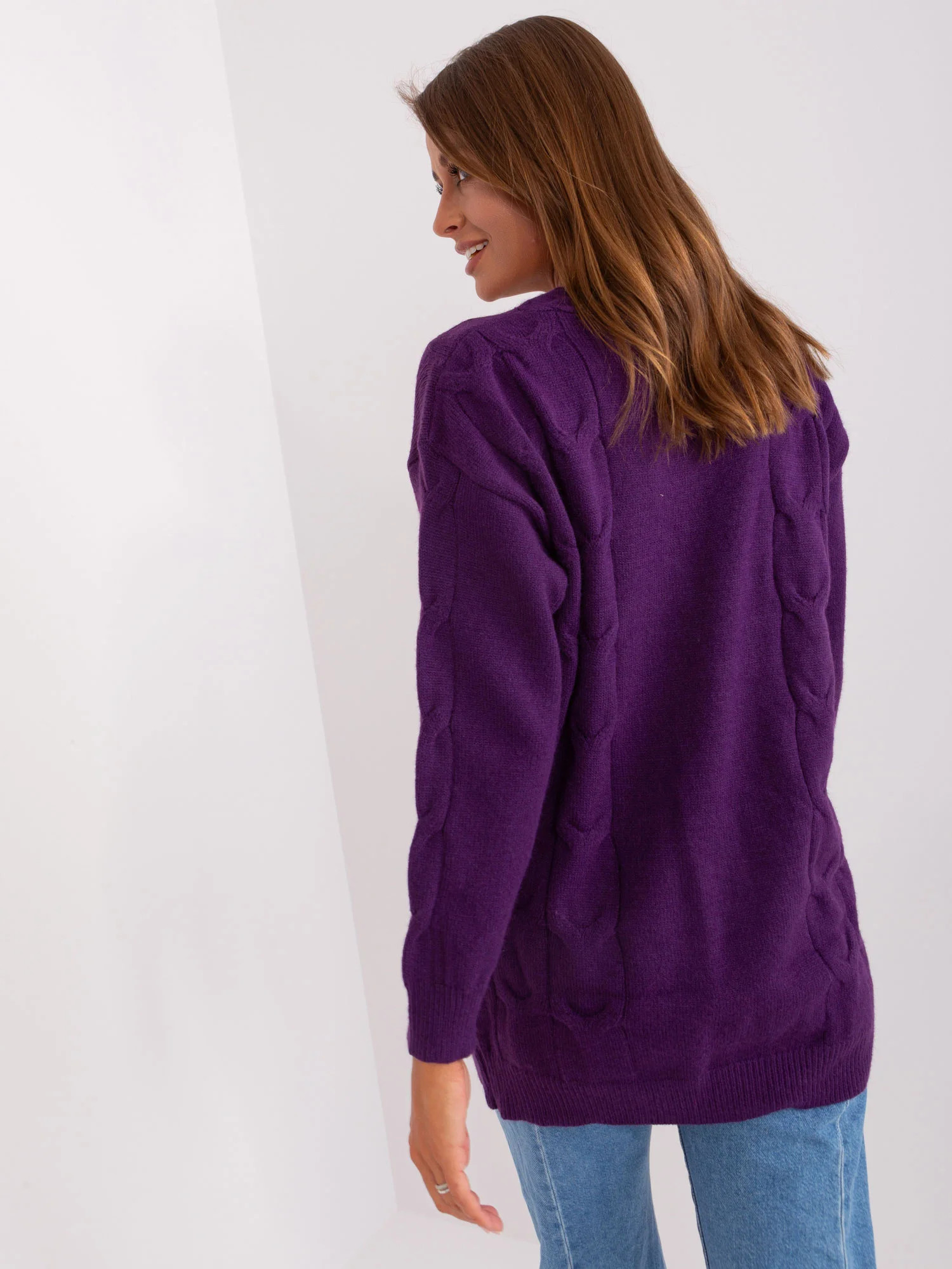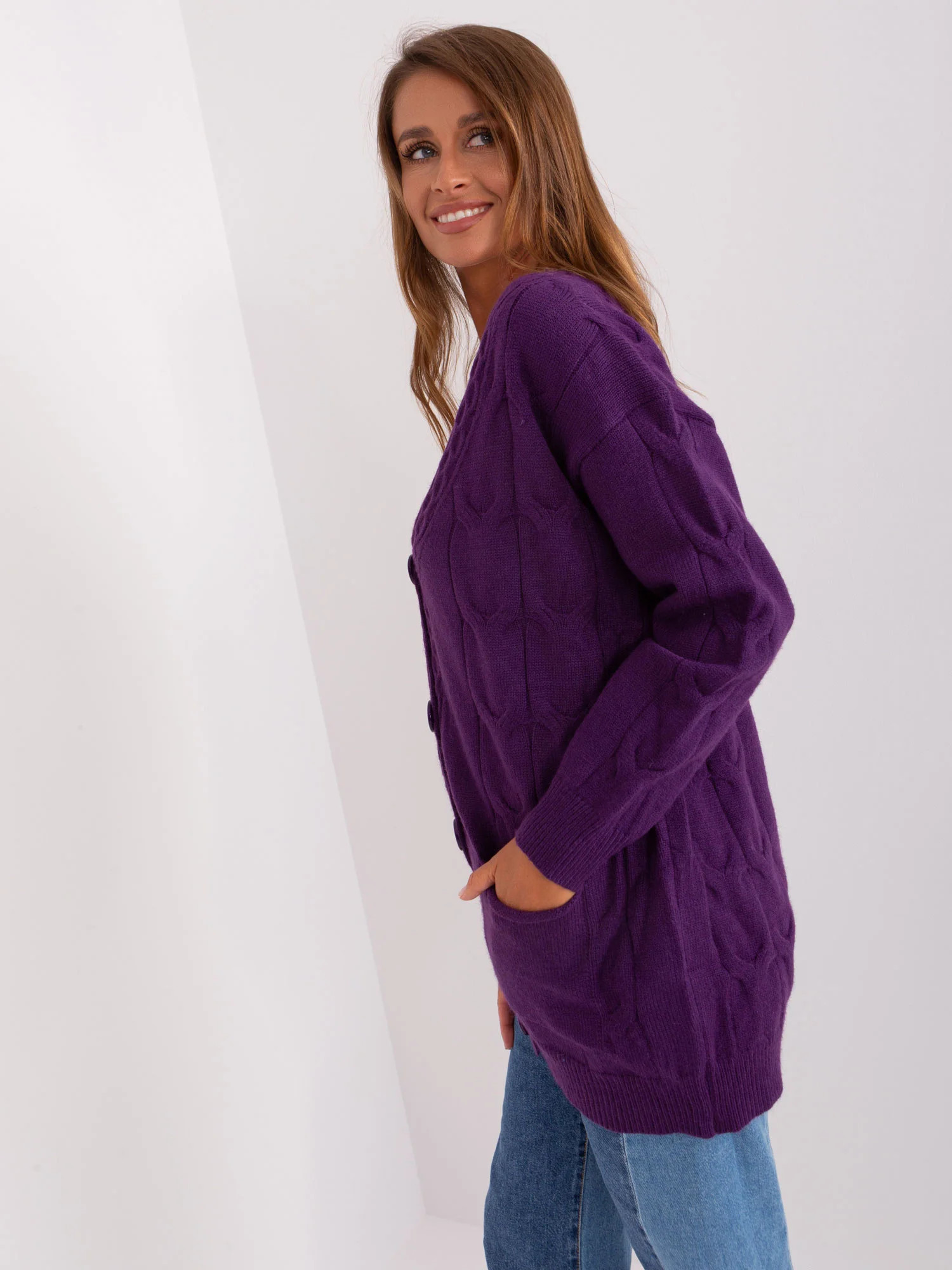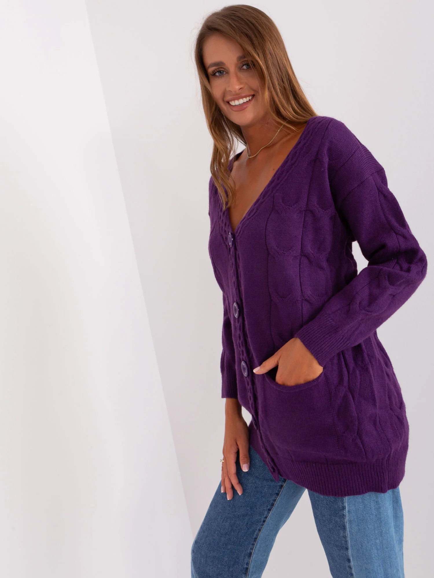 Tmavě fialový rozepínací svetr s kapsami .