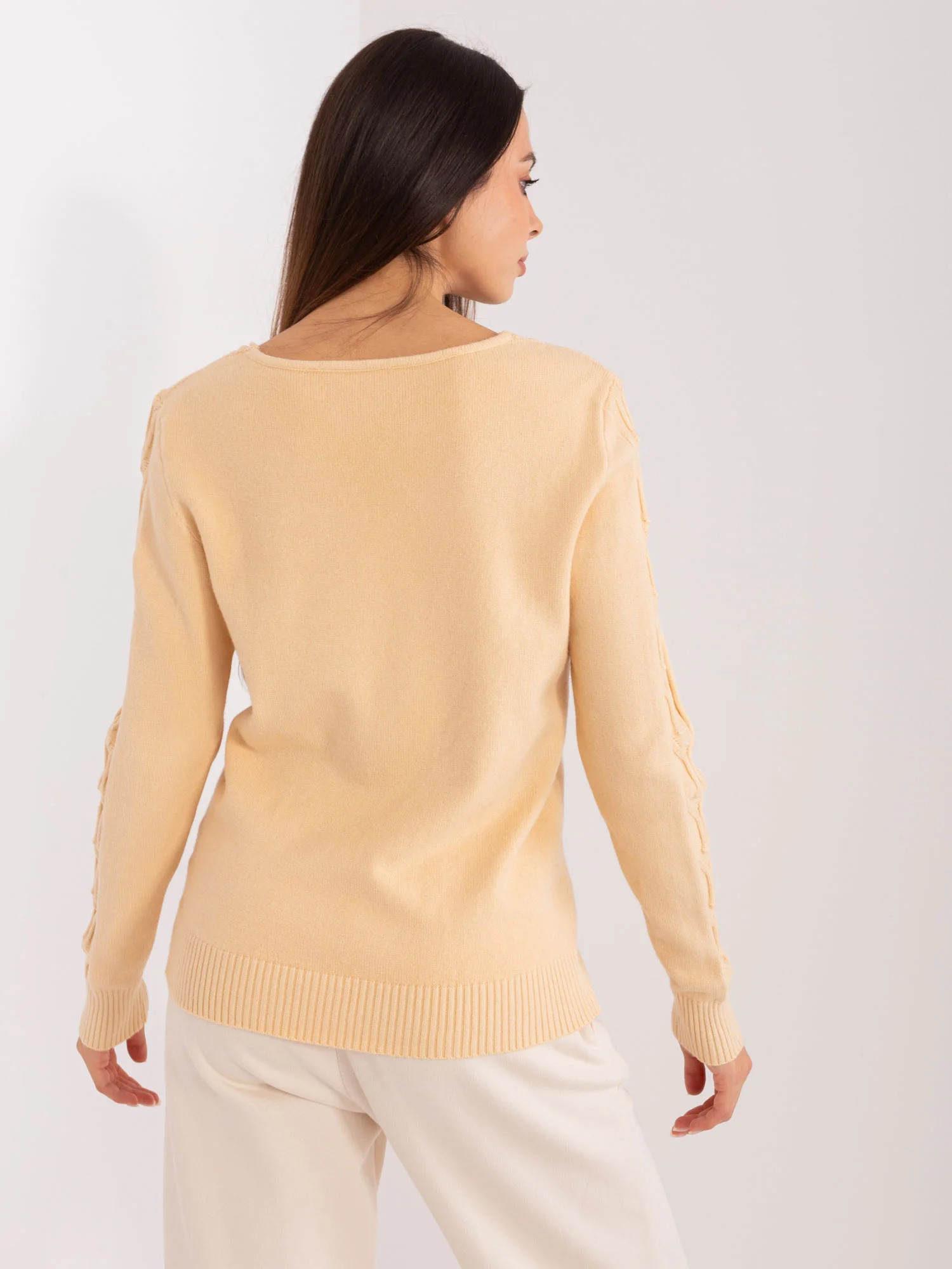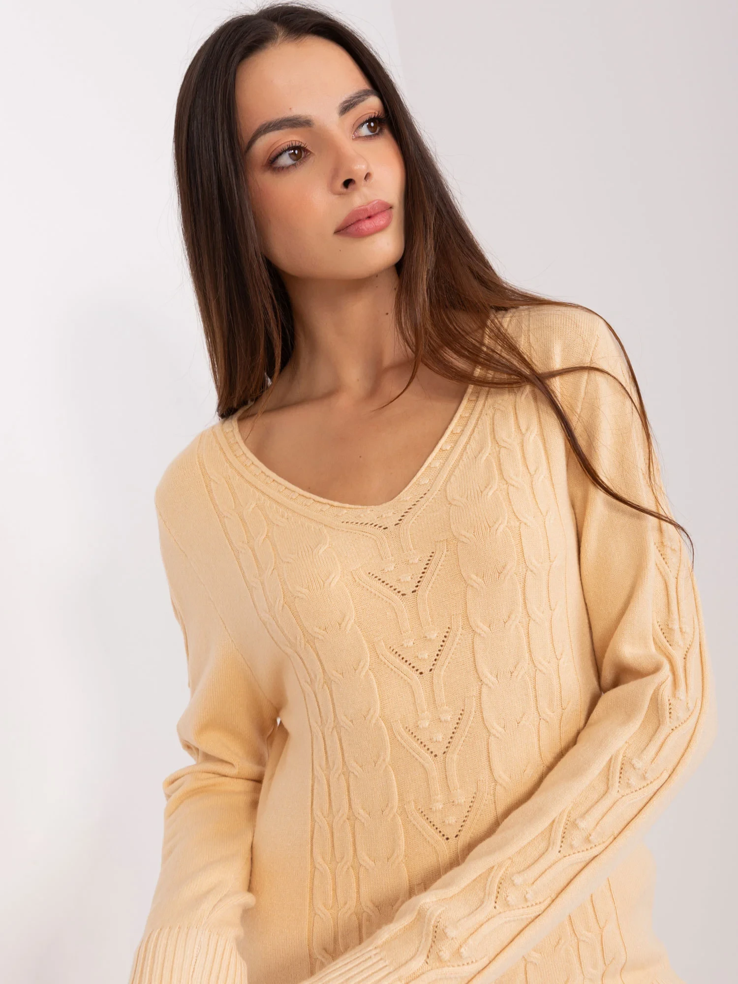 Béžový svetr s plédy a výstřihem do V .