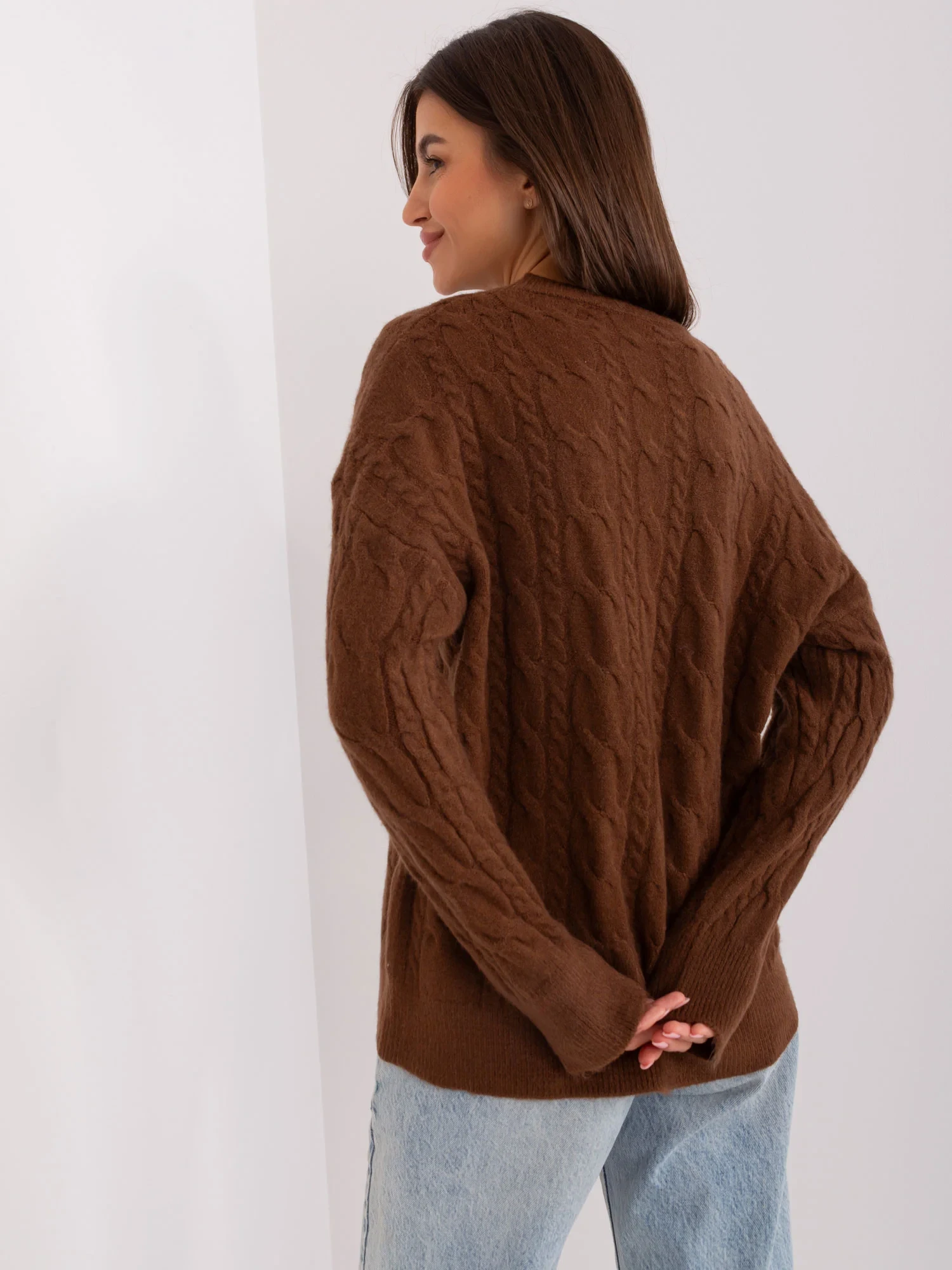 Hnědý svetr s plédy a žebrovanými lemy .