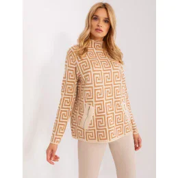 Velbloudí a béžový vzorovaný svetr s polovičním rolákem.