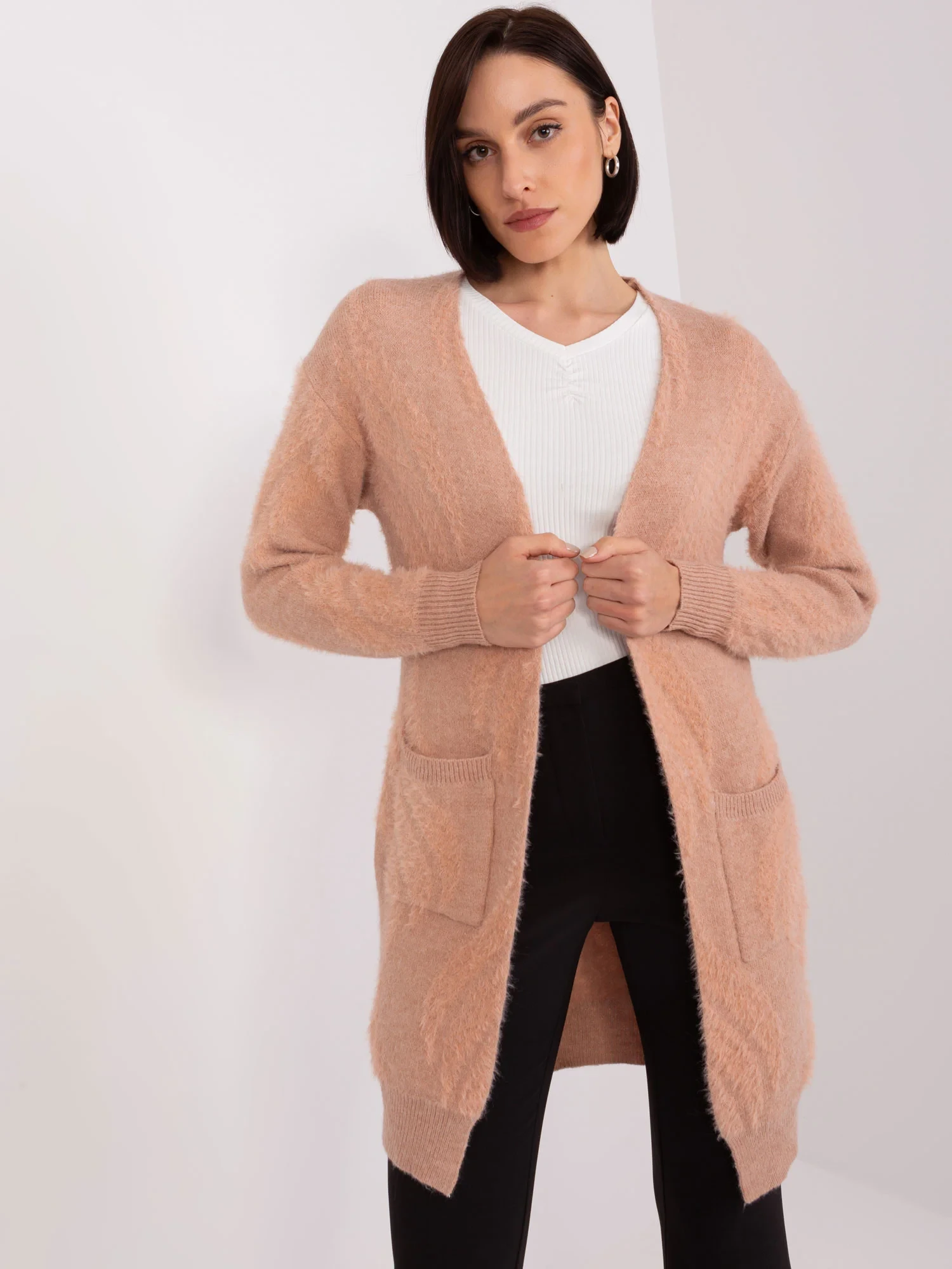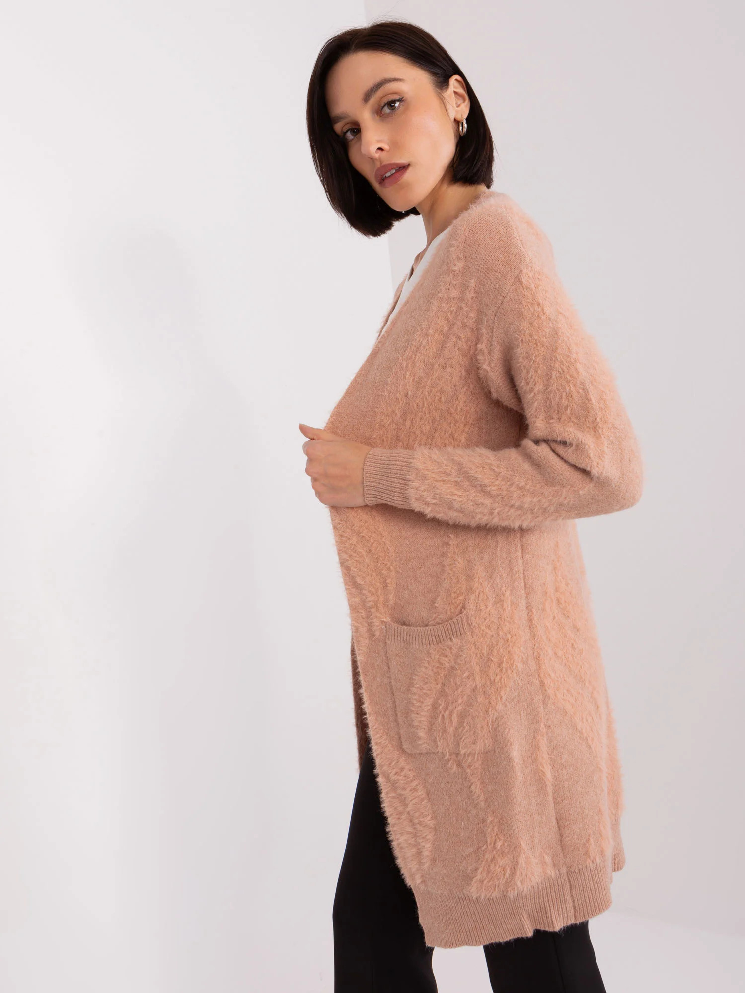 Broskvový dámský svetr s kapsami.