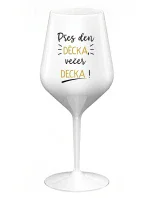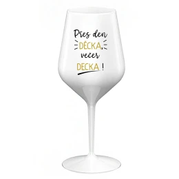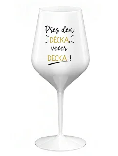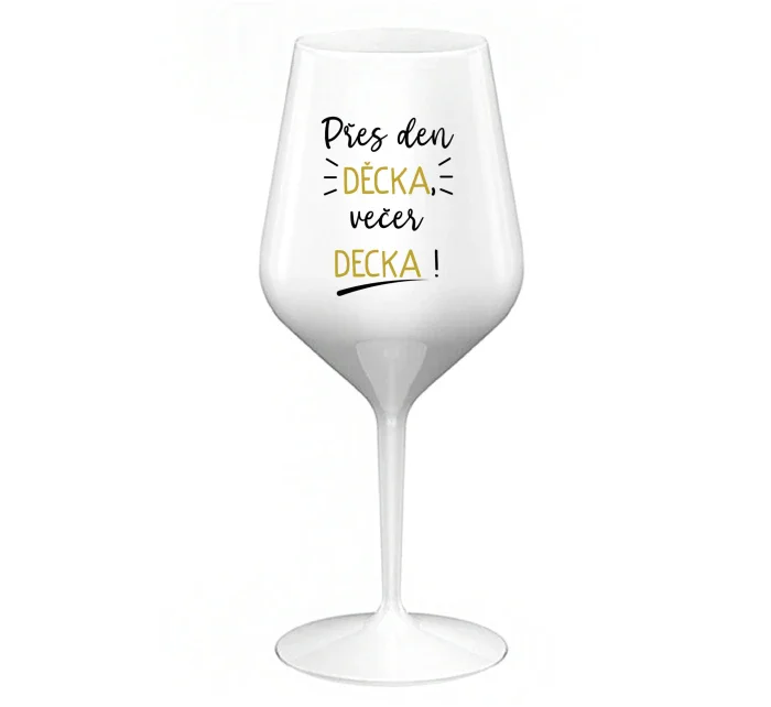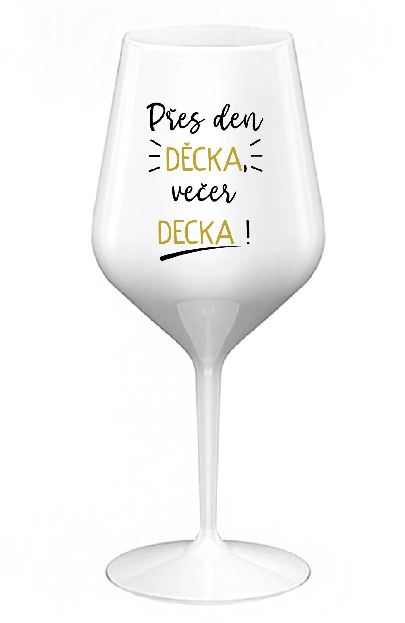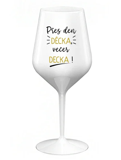 PŘES DEN DĚCKA, VEČER DECKA! - bílá nerozbitná sklenice na víno 470 ml