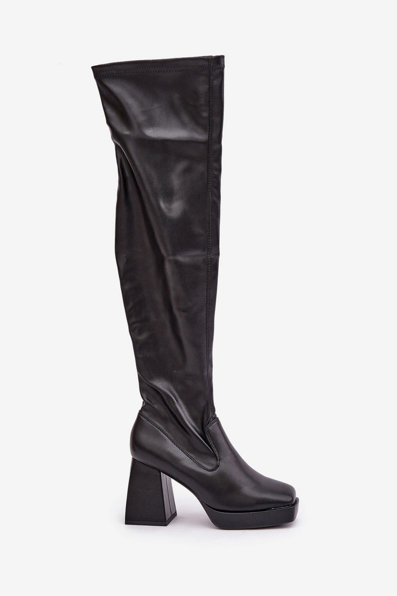 Přiléhavé dámské kozačky vyrobené z eko kůže, které dokonale zvýrazňují nohy. Usazené na stabilním sloupkovém podpatku, zajišťují eleganci a pohodlí. Svršek sahající nad koleno dodává šarm, zatímco čtvercové špičky dodávají moderní charakter. Model je bez zapínání, s dalším zipem, který usnadňuje obouvání. Stylové a ženské, skvělé pro různé příležitosti. Při výběru velikosti se řiďte tabulkou velikostí.