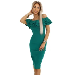 Elegantní španělské šaty s volánky na ramenou. zelená barva. midi střih a mega ženský střih. značka Numoco. polský výrobek. ideální na svatby, rande a oslavy.