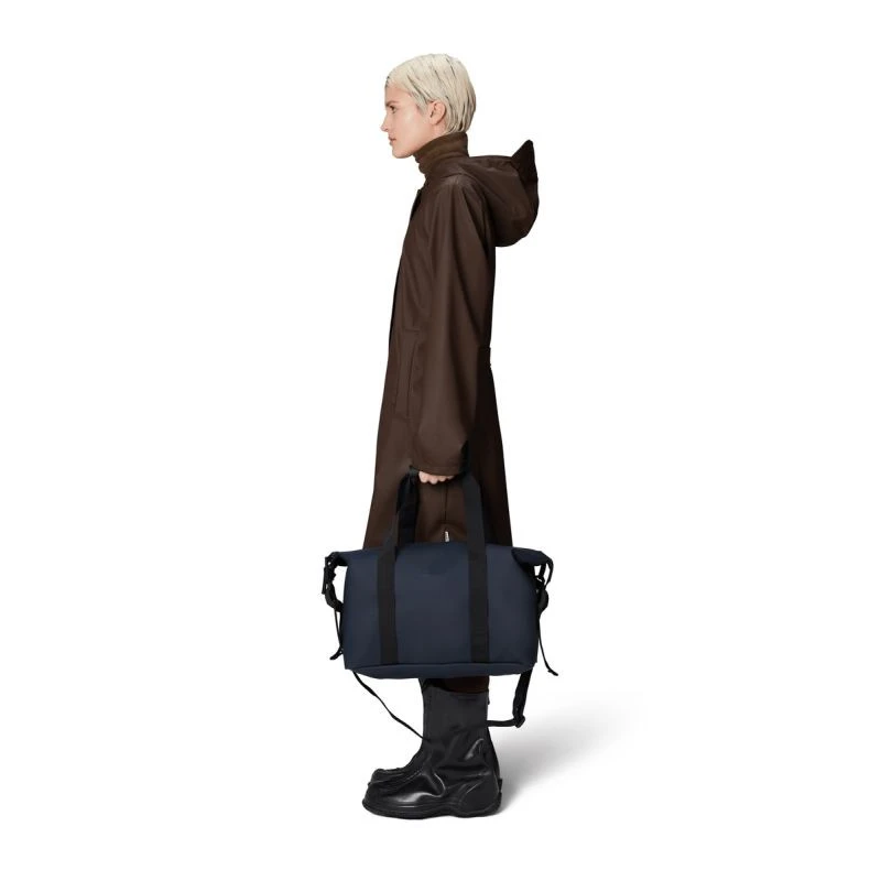 Hilo Weekend Bag Small jest wykonana z charakterystycznej dla Rains wodoodpornej tkaniny PU, zaprojektowanej z myślą o wytrzymałości, trwałości i gładkości w dotyku.