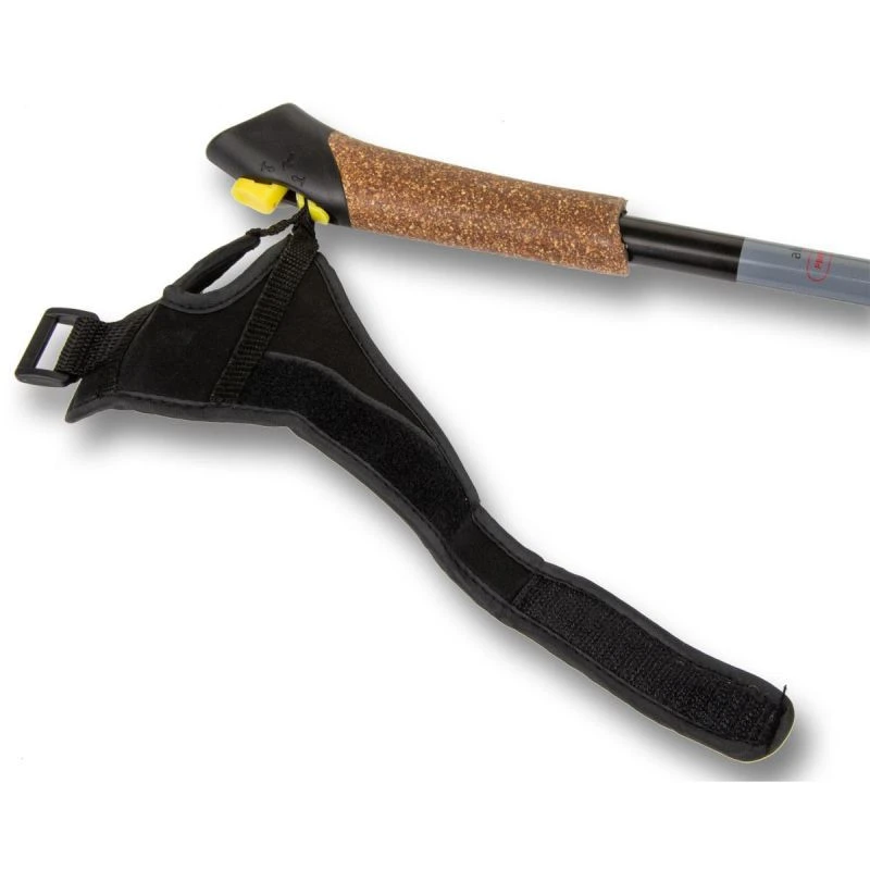 Ergonomiczna rękojeść zapewnia wygodne dopasowanie do dłoni, redukując zmęczenie podczas długich marszów. Odpinane zapięcia na nadgarstki gwarantują stabilność kijów i pozwalają na szybkie ich odczepienie bez zdejmowania całego uchwytu, co zwiększa komfort i funkcjonalność.