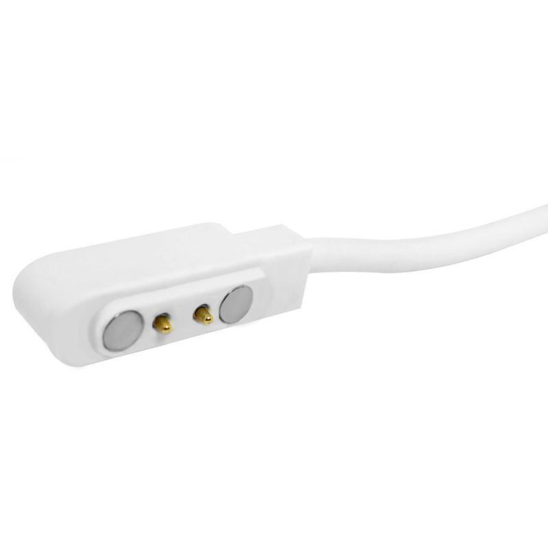 Kabel v bílé barvě, zakončený na jedné straně konektorem USB a na druhé straně kolíky, které jsou přitahovány magnetem.