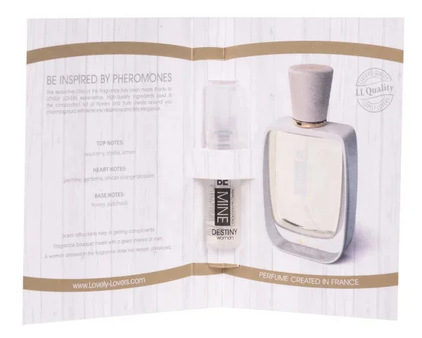 Svůdná dámská vůně ze série BEMINE vytvořena ve Francii. Díky zkušenostem značky LOVELY LOVERS byl použit molekulární vzorec I-L-Molecules (INTENSE LOVE MOLECULES), který je výsledkem výzkumu více než 300 vonných atraktantů v různých poměrech. Byly vybrány ty, které mají největší dopad na opačné pohlaví, čímž se z komplexu vonných olejů vytáhlo maximum. Vzorec I-L-Molecules byl zdokonalen tak, aby se synergicky doplňoval s vůní ženské pokožky a vytvořil tak jedinečný celek. Složení BEMINE DESTINY pro ženy je jedinečnou kombinací květinových tónů, propletených se šťavnatým ovocem na bázi rostlinných olejů a jemného medového podkresu. Nejvyšší koncentrace a kvalita použitých ingrediencí vám umožní vytvořit svůdnou auru plnou ženských vibrací a flirtující elegance.