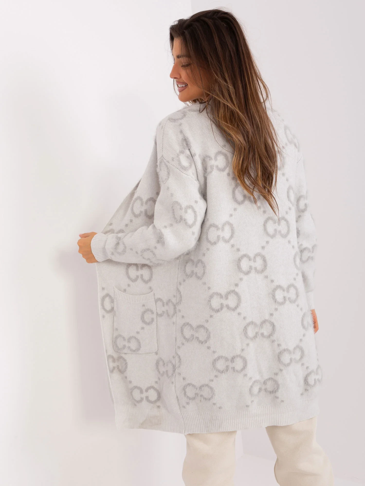 Světle šedý vzorovaný svetr s kapsami.