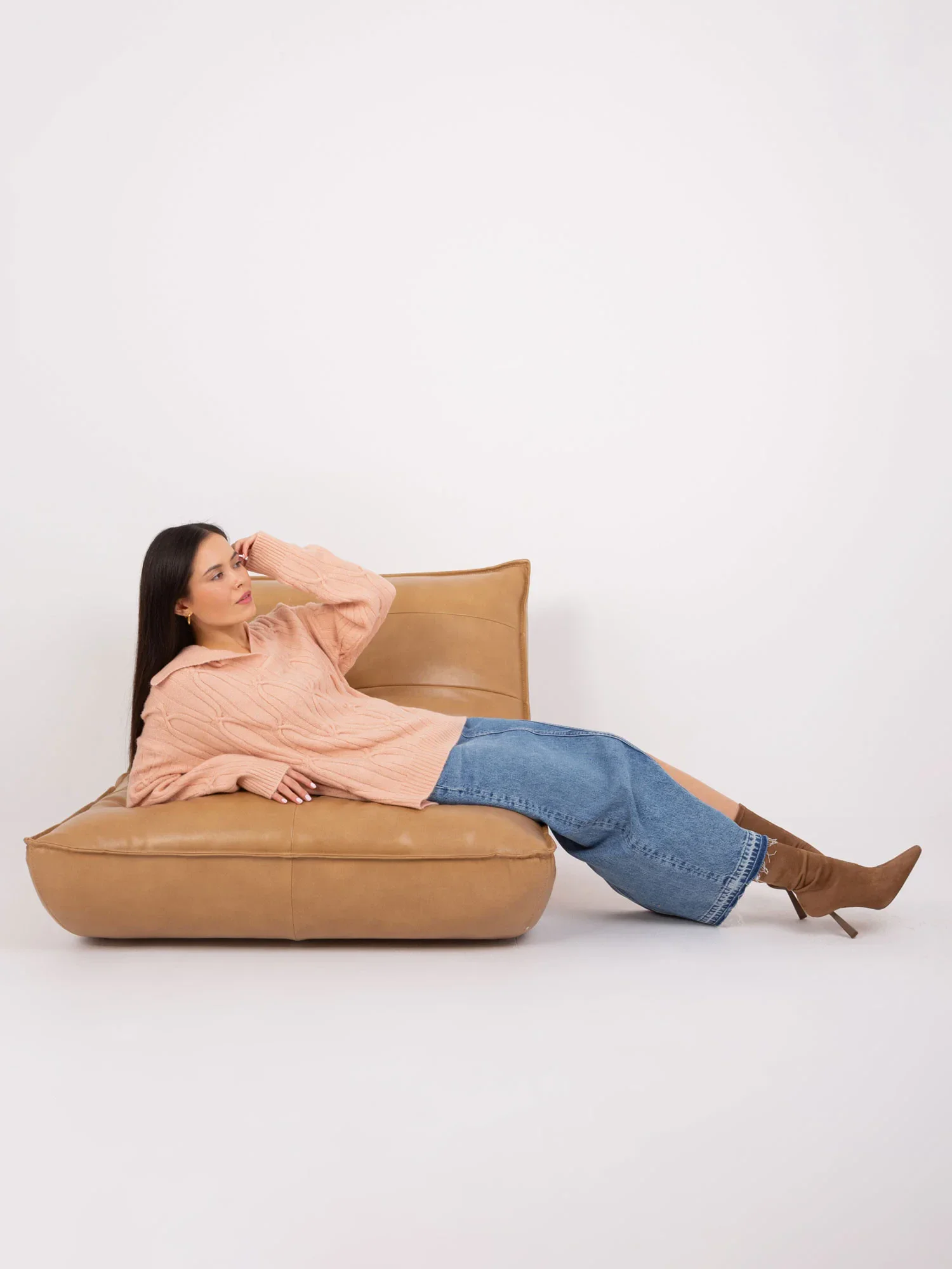 Broskvový svetr s plédy a límcem .