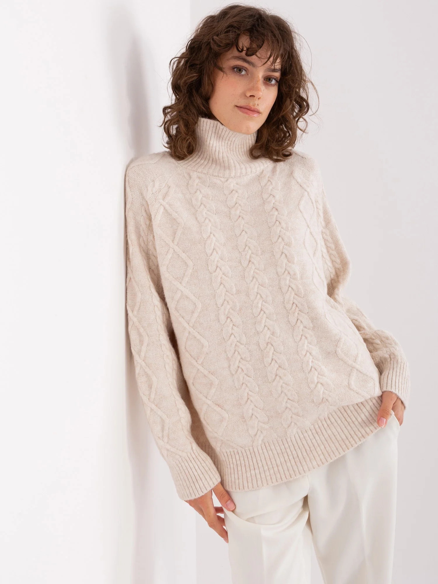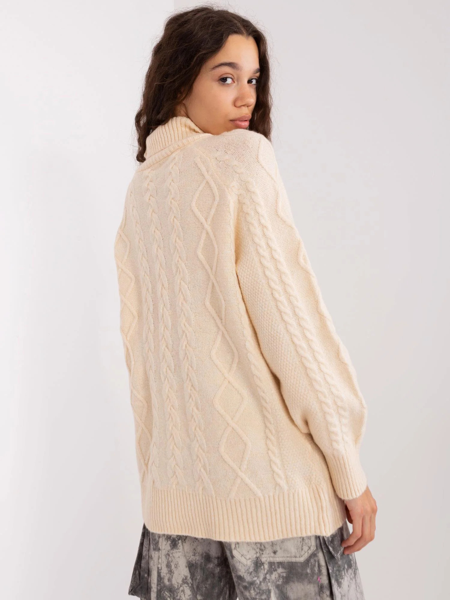 Rozměry svetru v jedné velikosti měřené na plocho: šířka v podpaží - 70 cm, délka rukávu - 60 cm, celková délka - 67 cm