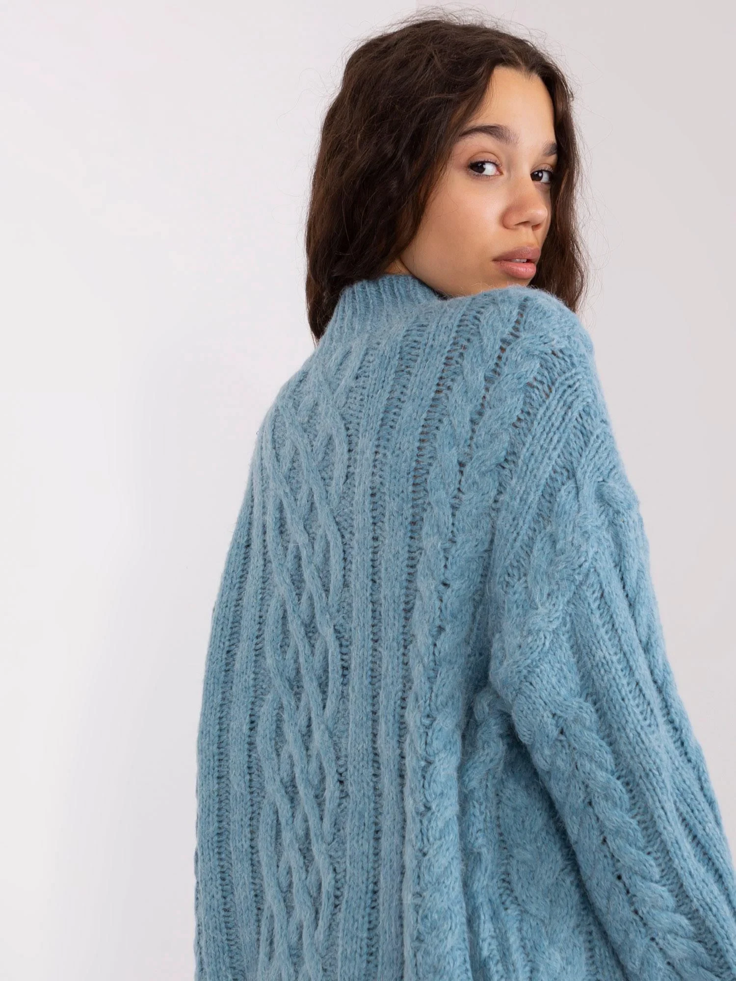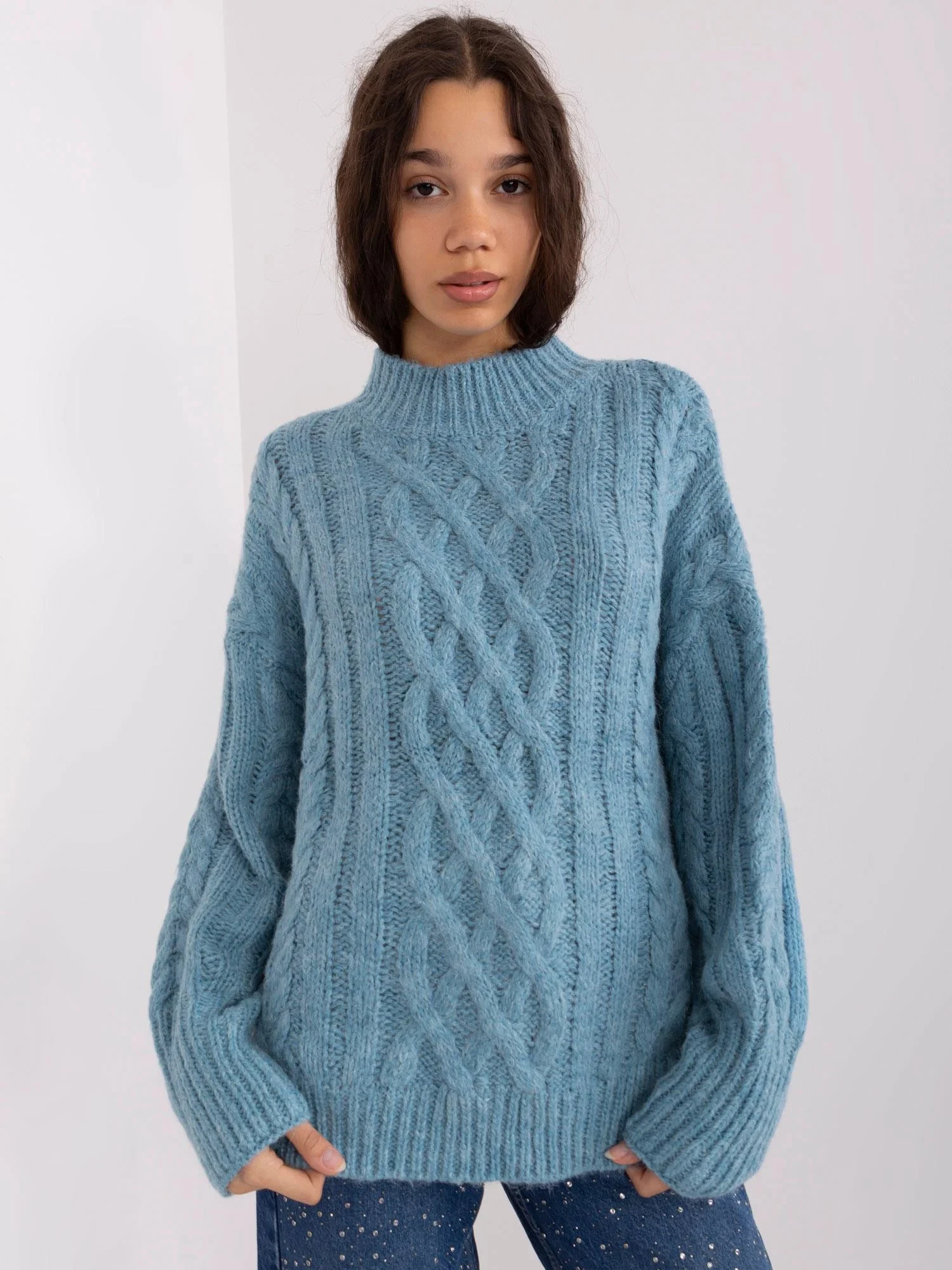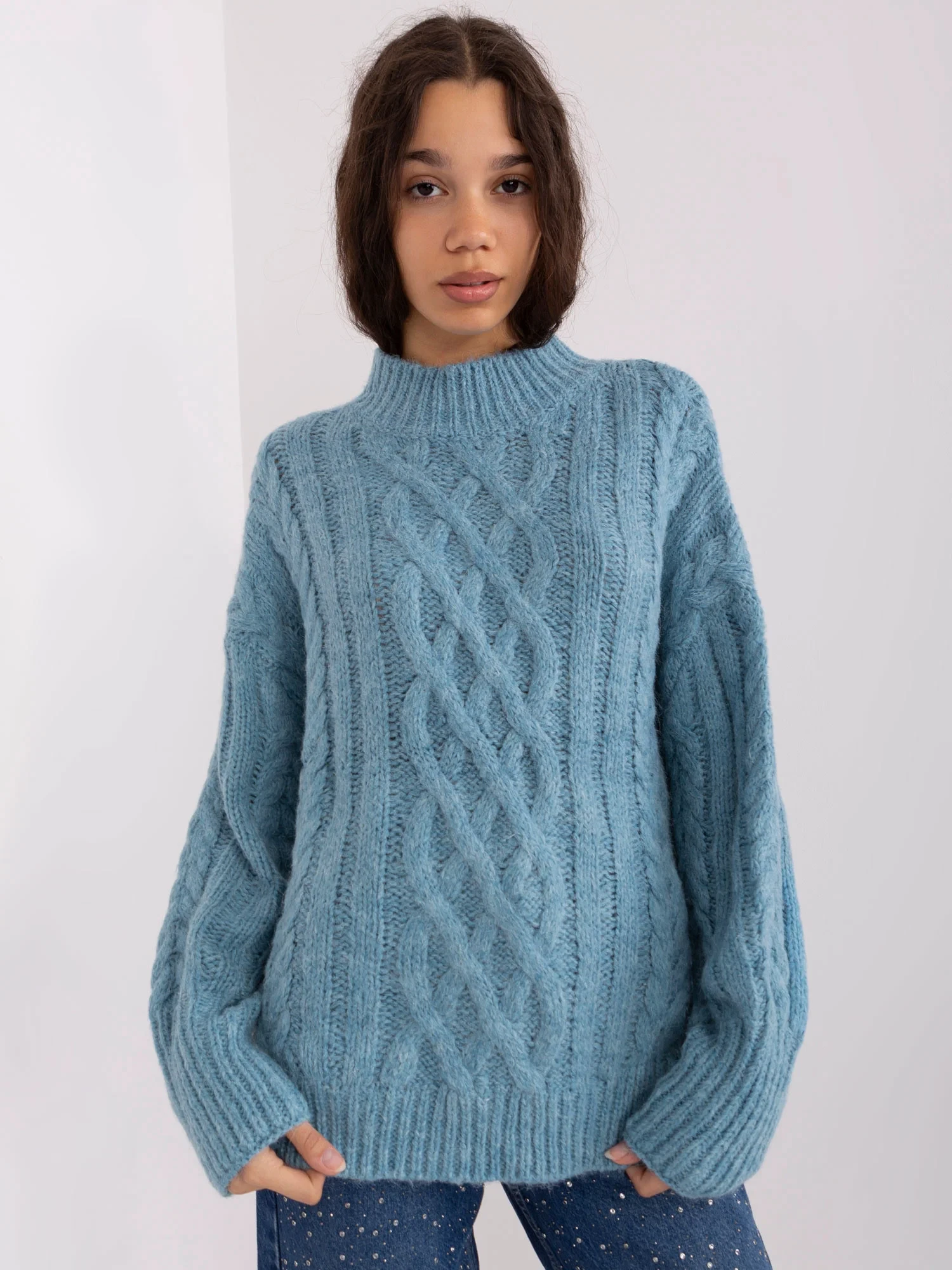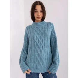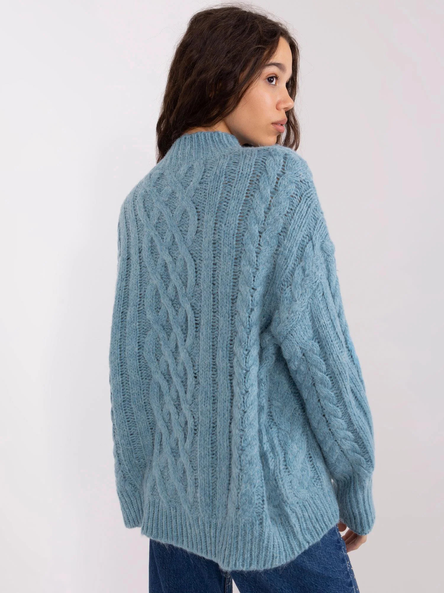 Modrý volný kostkovaný svetr .