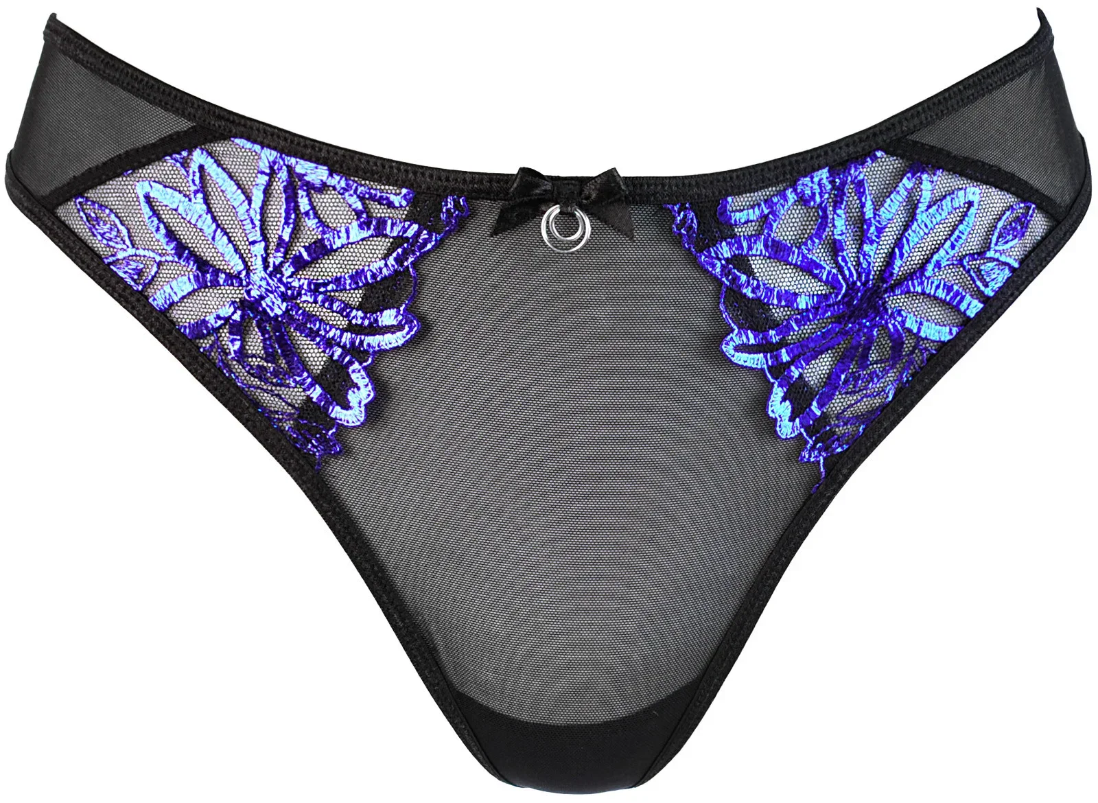 Elegantní a smyslné kalhotky string jsou vyrobeny z modročerné výšivky, která má třpytivý efekt, takže jsou neuvěřitelně podmanivé. Výšivka dodává kalhotkám jemnost a zároveň zdůrazňuje jejich exkluzivní charakter. Kalhotky jsou navíc doplněny kovovým kroužkem jako ozdobným ornamentem. Tento detail dodává designu originalitu a jedinečný akcent. Kovový prvek také vytváří zajímavý kontrast vůči vzorům, což vede k harmonické kombinaci. Zadní část kalhotek je vyrobena z jemného černého tylu. Materiálové složení: Polyamid 89 %, bavlna 7 %, elastan 4 %