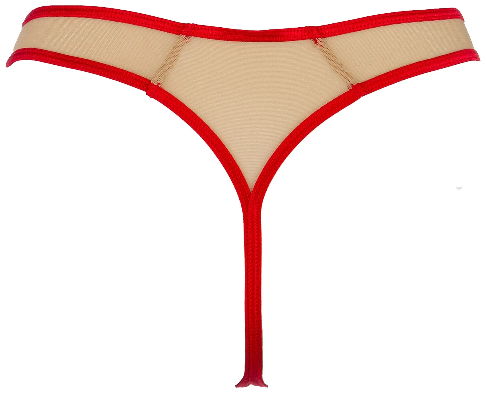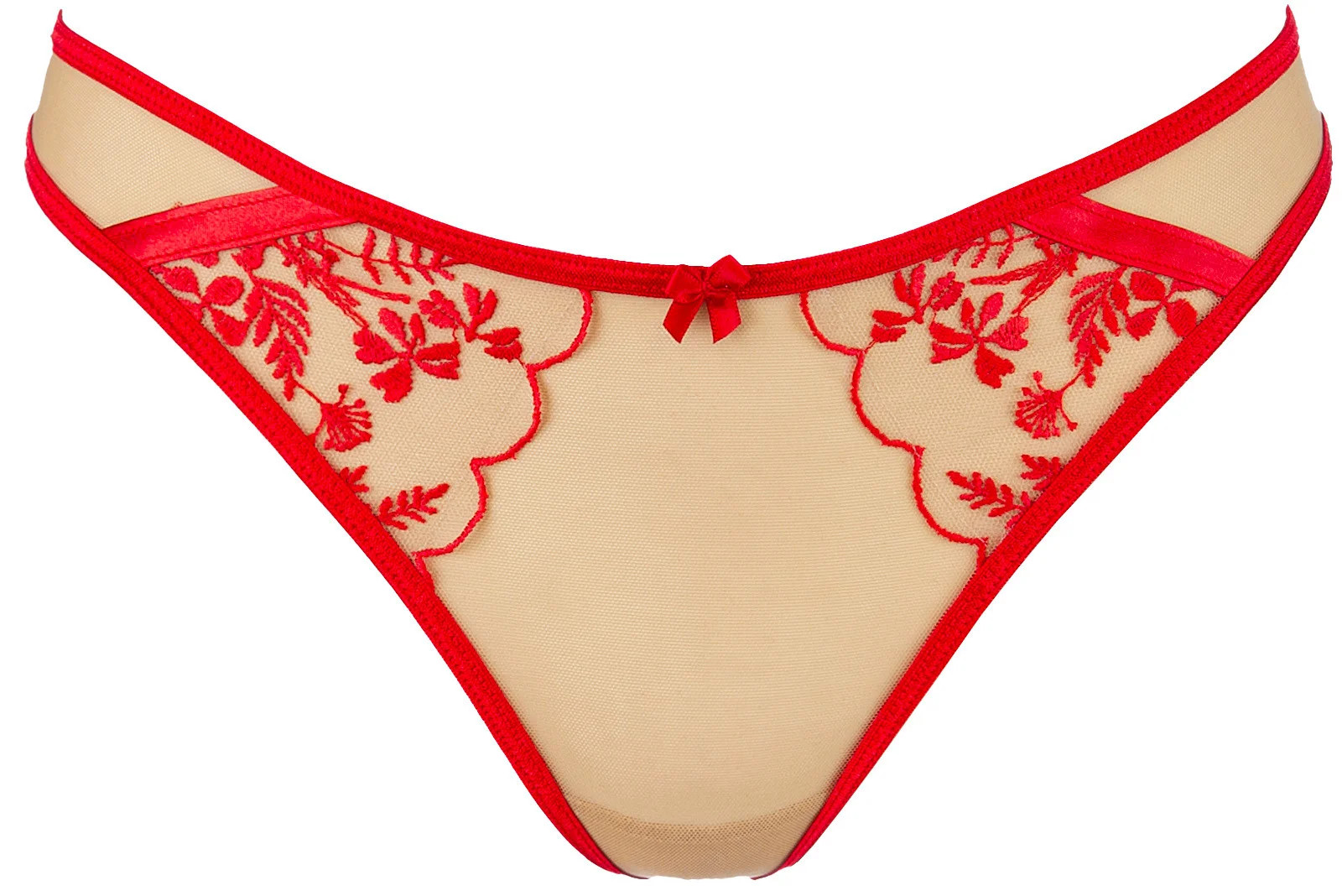 Béžovo-červená tanga s drobnými, červenými květy jsou romantickým doplňkem k podprsence V-11091, ve které oslníte. Konstrukce tang je vyrobena tak, aby zdůraznila a odhalila křivky vašeho zadečku. Výrobek je vyroben z tylu a bohatě zdoben, červenou výšivkou. Kalhotky mají pohodlný bavlněný klín.