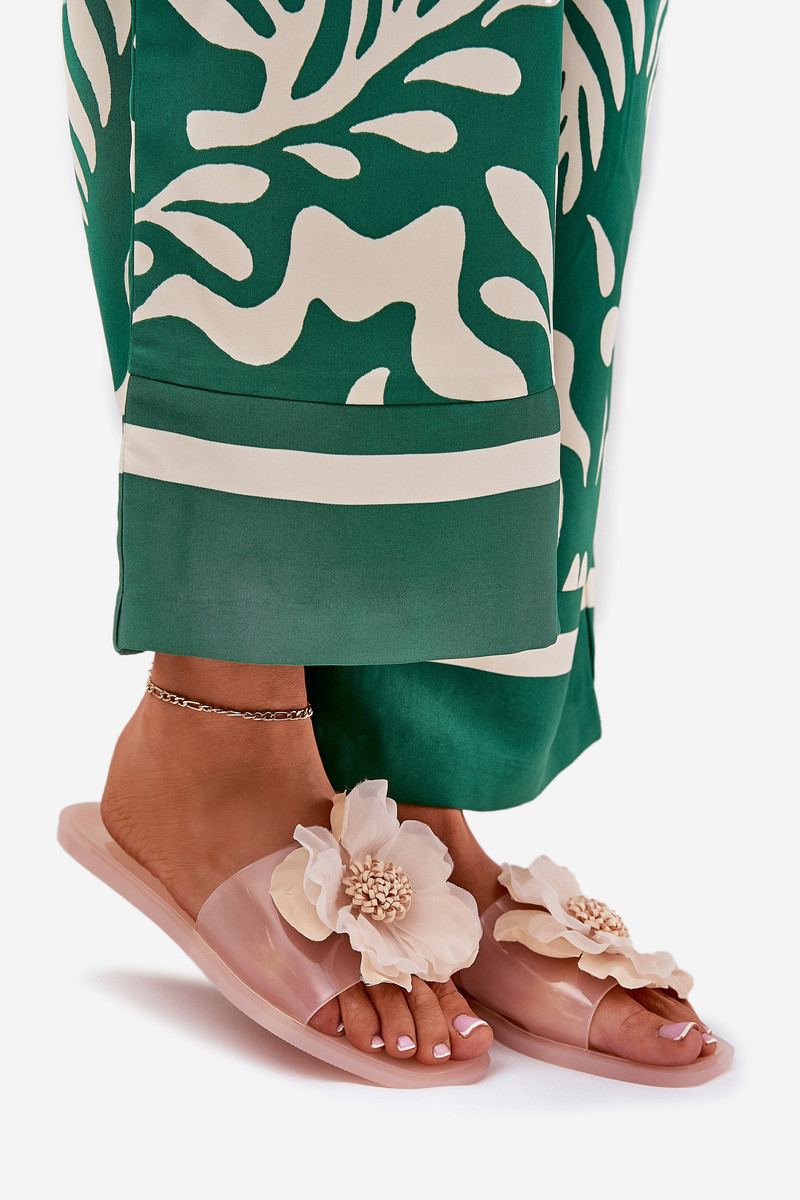 Stylové dámské pantofle s transparentním svrškem, které se vyznačují lehkostí a moderním vzhledem. Umístěny na ploché podrážce, poskytují pohodlí na každodenní nošení. Na přední straně obuvi je ozdobná umělá květina, která jim dodává jemnou ženskost a svěžest. Ideální na letní dny, skvěle se hodí k lehkým šatům, sukním nebo šortkám, vnášejíce trochu elegance a svěžesti do každého outfitu. Při výběru velikosti se řiďte tabulkou velikostí.