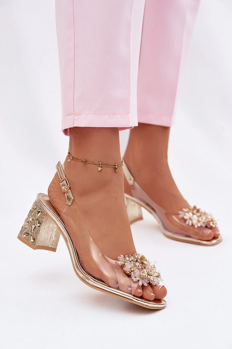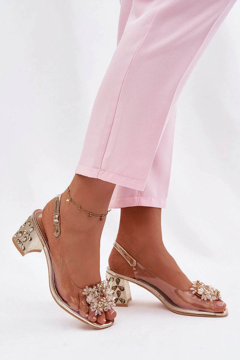 Průhledné sandály na podpatku s krystaly model 22102733 Zlaté - VINCEZA
